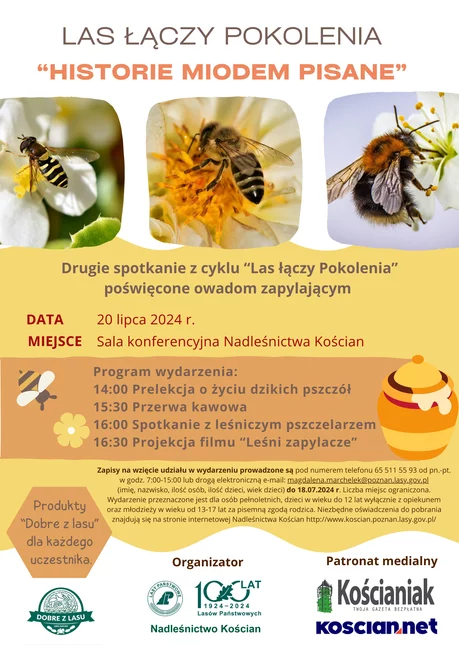 Na wydarzenie "Historie miodem pisane" obowiązują zapisy (telefoniczne 65 511 55 93 pn-pt godz. 7:00-15:00 lub drogą elektroniczną e-mail: magdalena.marchelek@poznan.lasy.gov.pl) do dnia 18.07.2024 r.