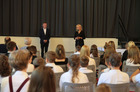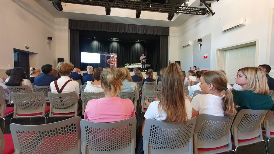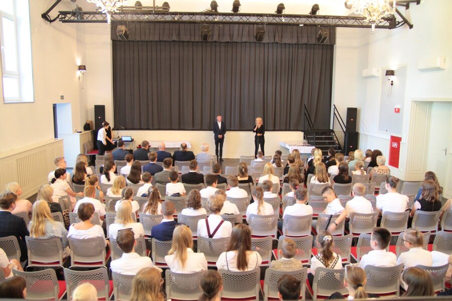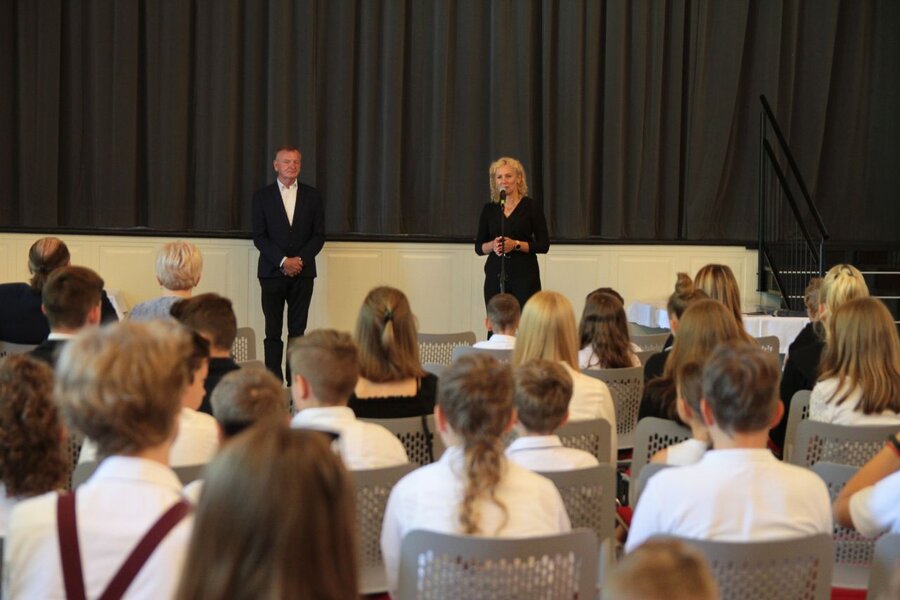 W sali widowiskowej Centrum Kultury w Śmiglu z uczniami spotkała się burmistrz Małgorzata Adamczak i Przewodniczący Rady Miejskiej Śmigla Wiesław Kasperski.