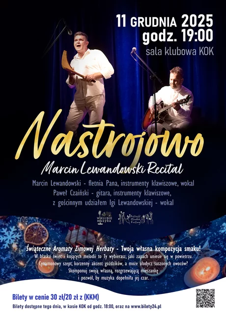 Kościański Ośrodek Kultury zapowiada kolejną odsłonę cyklu „W klubie muzyka”. Tym razem klubowa sala KOK-u zamieni się w kameralną przestrzeń, w której dźwięk połączy się z aromatem zimowej herbaty. Gościem wieczoru będzie Marcin Lewandowski – multiinstrumentalista związany od lat z fletnią Pana.