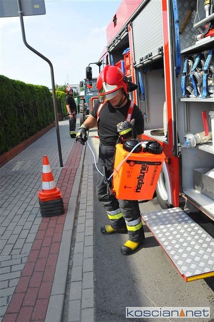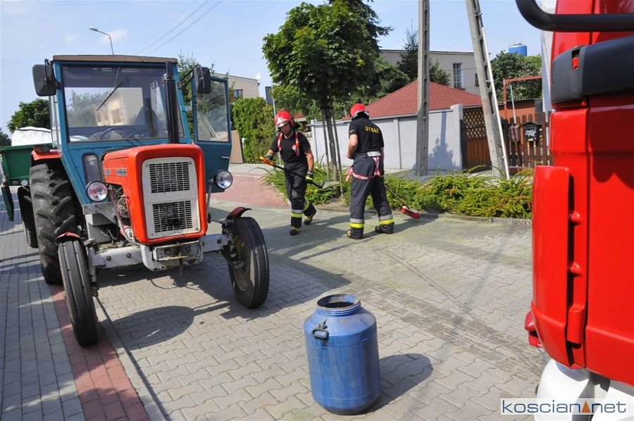 Kościańscy strażacy usuwali dziś z jezdni na ulicy Fabiańczyka w Kościanie paliwo, które wyciekło z rolniczego ciągnika.