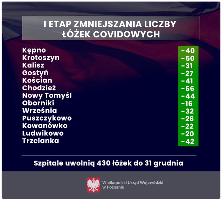 W pierwszym etapie liczba łóżek zmniejszy się: w Kępnie (40 mniej), Krotoszynie (50), Kaliszu (31), Gostyniu (27), Kościanie (41), Chodzieży (66), Nowym Tomyślu (44), Obornikach (16), Wrześni (32), Puszczykowie (26), Kowanówku (22), Ludwikowie (20), Trzciance (42). Szpitale mają uwolnić 430 łóżek do 31 grudnia br.