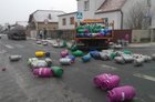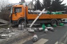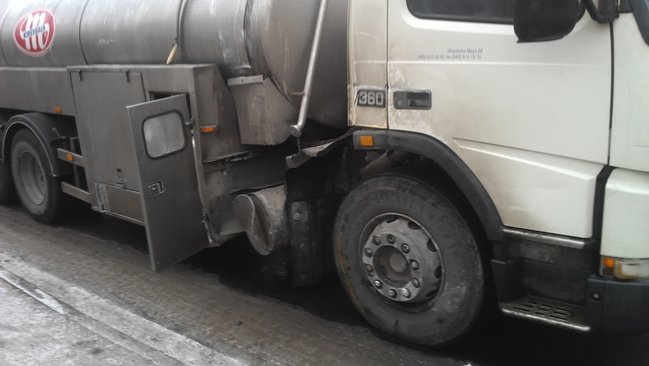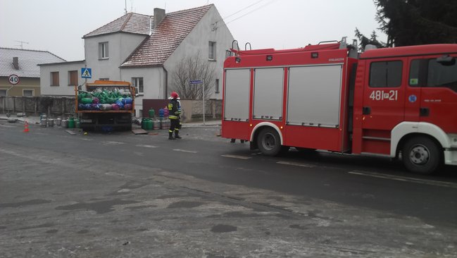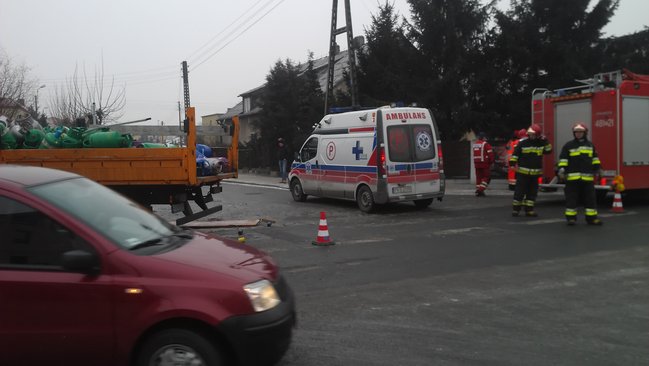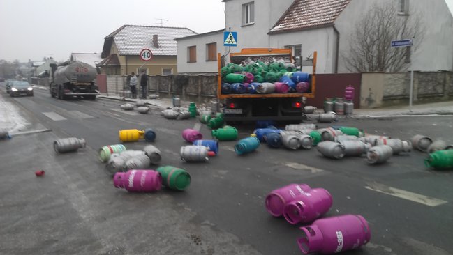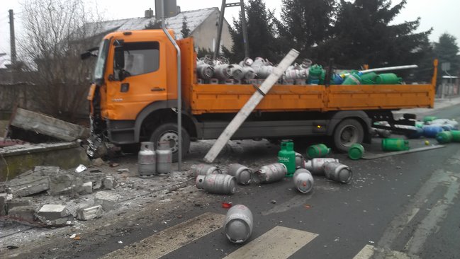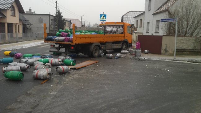 Jak informuje oficer dyżurny kościańskiej policji, sprawcą kolizji był 26-letni kierowca ciężarowego mercedesa przewożącego butle gazowe. Wyjeżdżając z ul. Grątkowskiej na ul. Sierakowskiego nie ustąpił pierwszeństwa przejazdu ciężarowce przewożącej mleko. W wyniku zderzenia na jezdnię wypadły przewożone butle uszkadzając przy okazji jadącego ul. Sierakowskiego vw golfa. Sprawca kolizji zakończył jazdę na ogrodzeniu sąsiadującej ze skrzyżowaniem posesji.