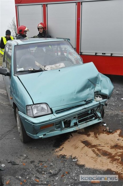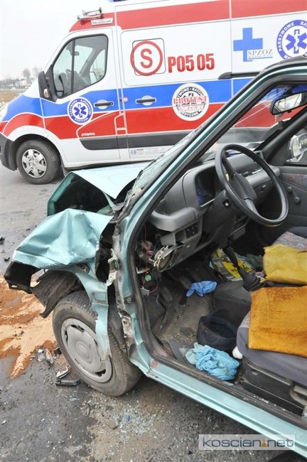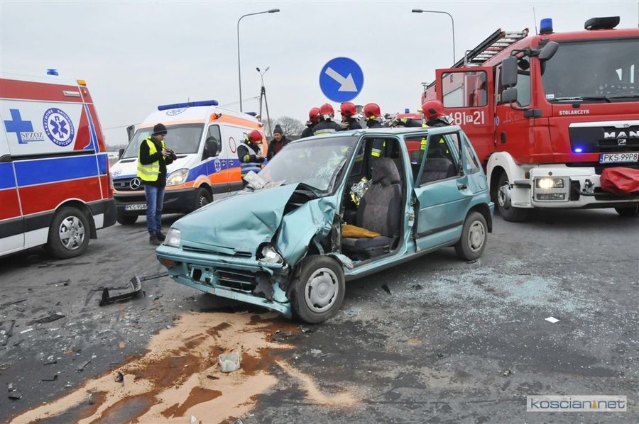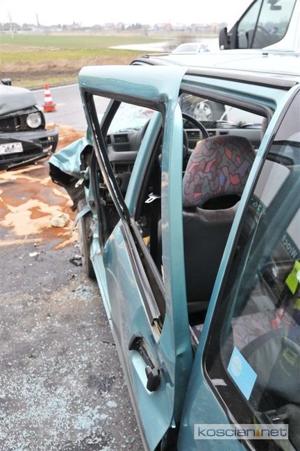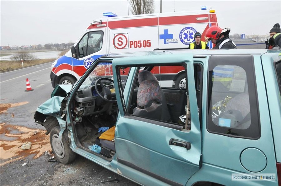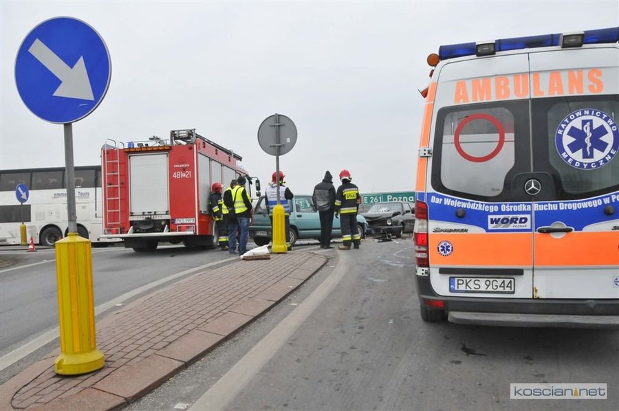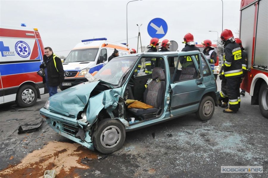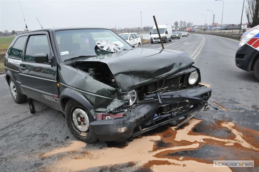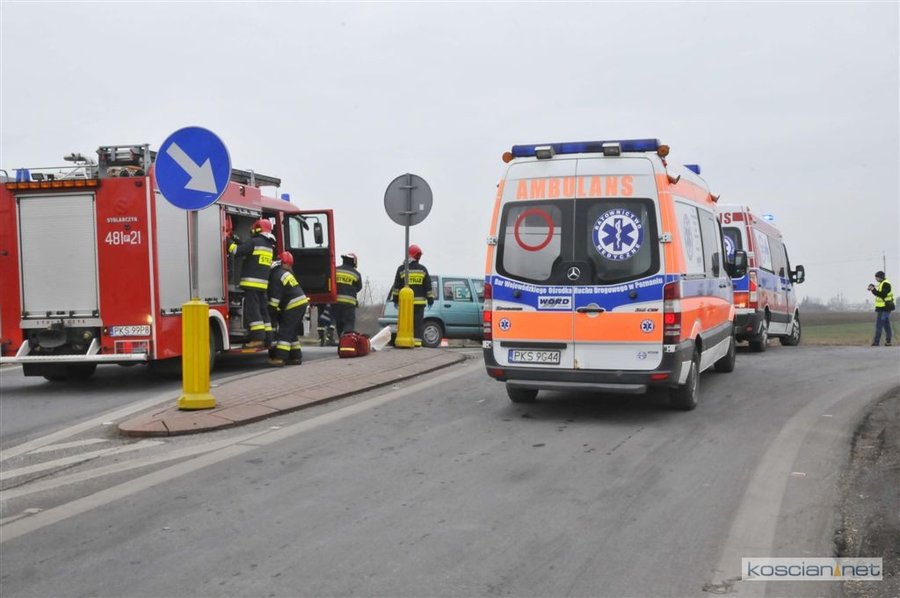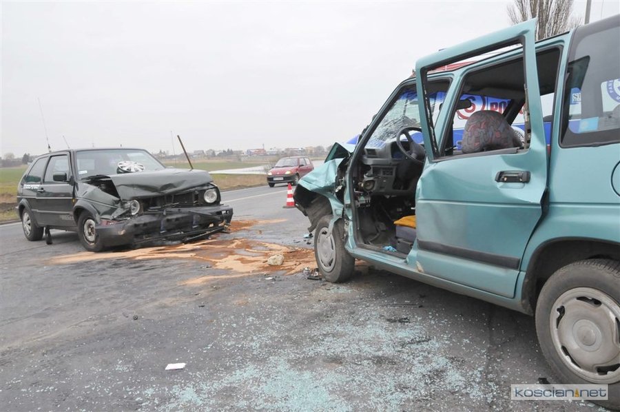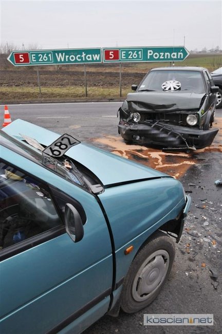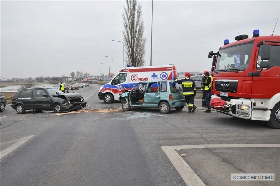 Do zdarzenia doszło około godziny 13. na obwodnicy Kościana. Jadący od strony Poznania volkswagen golf zjeżdżając z obwodnicy do miasta zderzył się z jadącym od strony Leszna daewoo tico. Na badania przewieziono do szpitala wszystkich uczestników zdarzenia – łącznie cztery osoby.