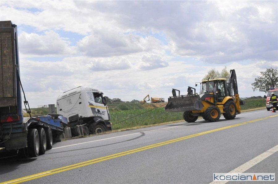 Do zdarzenia doszło we wtorek, 2 lipca, około godziny 13.45, na drodze krajowej nr 5 pomiędzy Czaczem a Poninem. Jak wynika ze wstępnych ustaleń, kierujący ciężarówką 28-letni mieszkaniec gminy Śmigiel ostro zahamował chcąc uniknąć zderzenia z poprzedzającym go pojazdem, który zaczął hamować. Prowadzony przez niego zestaw „złamał się” w wyniku czego ciągnik zjechał do rowu. W kolizji nikt nie ucierpiał.