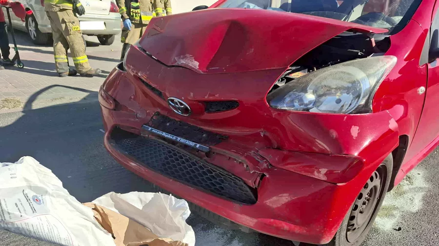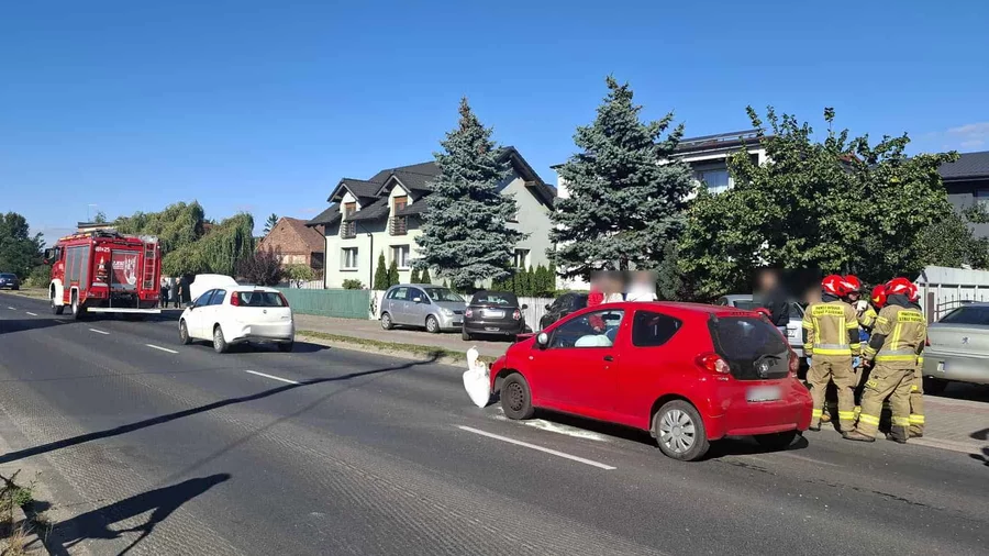 Na miejscu pracowali strażacy, którzy zabezpieczyli miejsce kolizji i usunęli z jezdni rozbite elementy pojazdów.