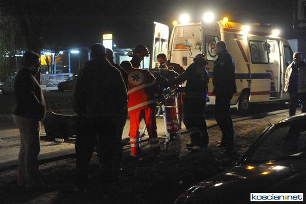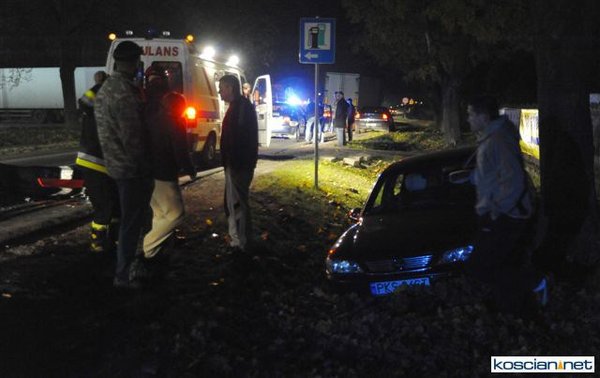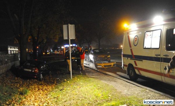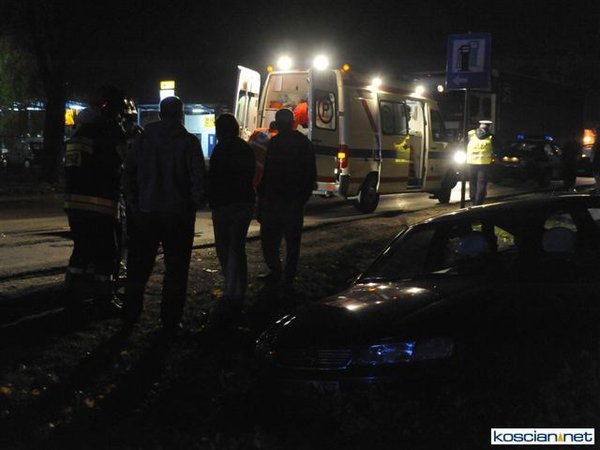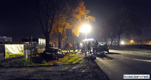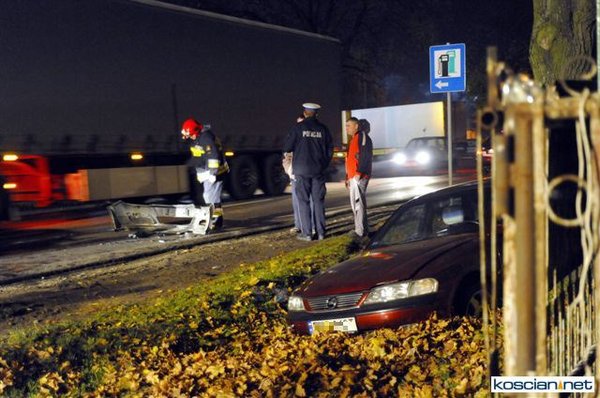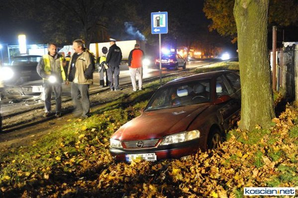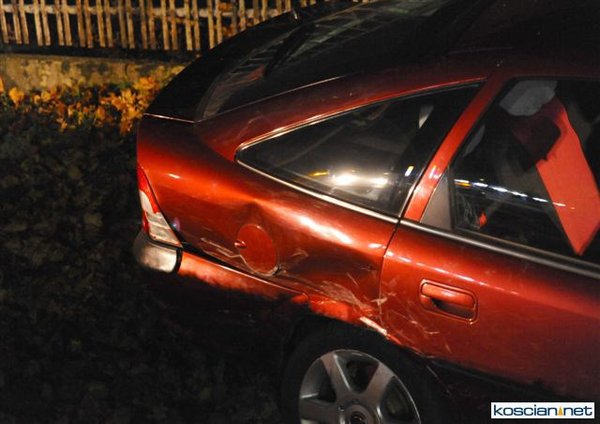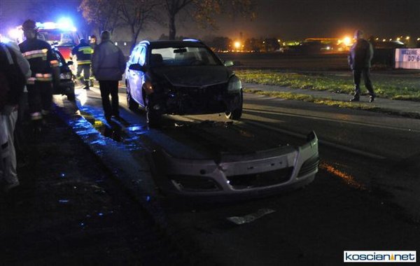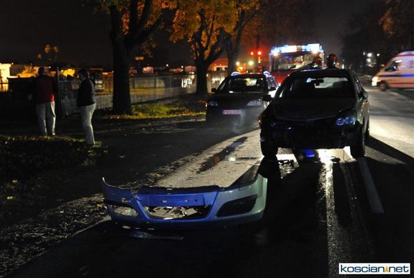 Dziś (25.10.10) po godzinie 19. przy wjeździe do Kościana od strony Racotu kierowca opla vectry nie opanował pojazdu i wpadł w poślizg. Uderzył w opla astrę, który po uderzeniu vectry uszkodził zaparkowany za nim samochód. Kierowcę vectry odwieziono do szpitala.