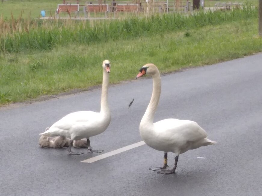 Do zdarzenia doszło w sobotę, 28 maja, około godziny 13. na ulicy Dworcowej w Racocie. Policjanci ruchu drogowego zauważyli dwa łabędzie z młodymi, które znajdowały się na środku drogi.