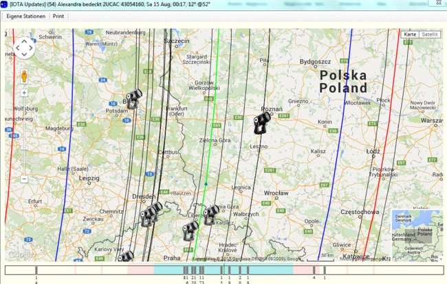 Na mapie zaznaczono miejsca obserwacji oraz granice cienia (niebieskie linie) i środek (zielona).