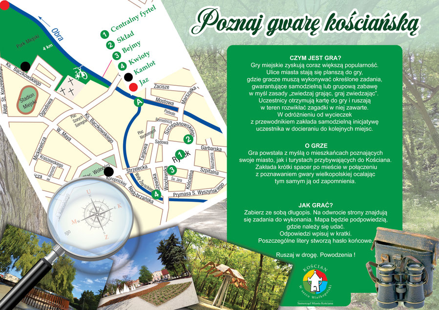 Do pobrania jest także karta z pytaniami do gry „Kościan dawniej i dziś.” Podczas spaceru po mieście należy odwiedzić wszystkie punkty zaznaczone na mapie. Do każdego numeru przypisana jest treść zadania do wykonania. Odpowiedzi należy wpisać w kratki. Poszczególne litery stworzą hasło końcowe. Kartę do samodzielnego wydrukowania można pobrać ze strony: https://koscian.pl/files/16533/2-strona.jpg