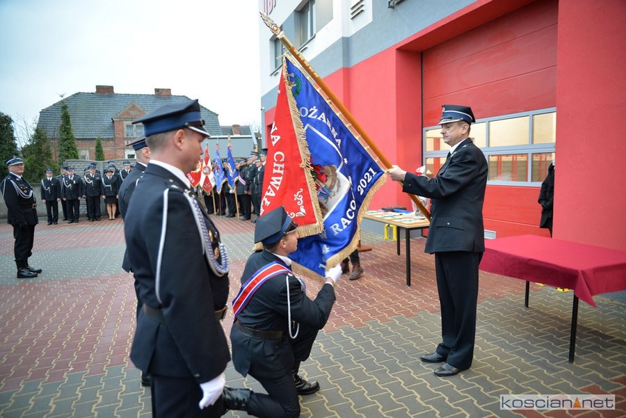 Podczas sobotniej uroczystości poświęcono nowy sztandar jednostki oraz odznaczono racockich druhów. Złote Medale za Zasługi dla Pożarnictwa otrzymali: Łukasz Browarczyk, Jacek Donaj, Wojciech Lewiński, Konrad Szulc. Srebrne Medale za Zasługi dla Pożarnictwa otrzymali: Damian Stanisławiak, Robert Ziemniak, Bartosz Kaczmarek, Sławomir Borowiak. Brązowe Medale za zasługi dla Pożarnictwa otrzymali: Kamila Andrzejewska, Kamila Woźna, Krzysztof Klak i Piotr Chraplak.