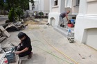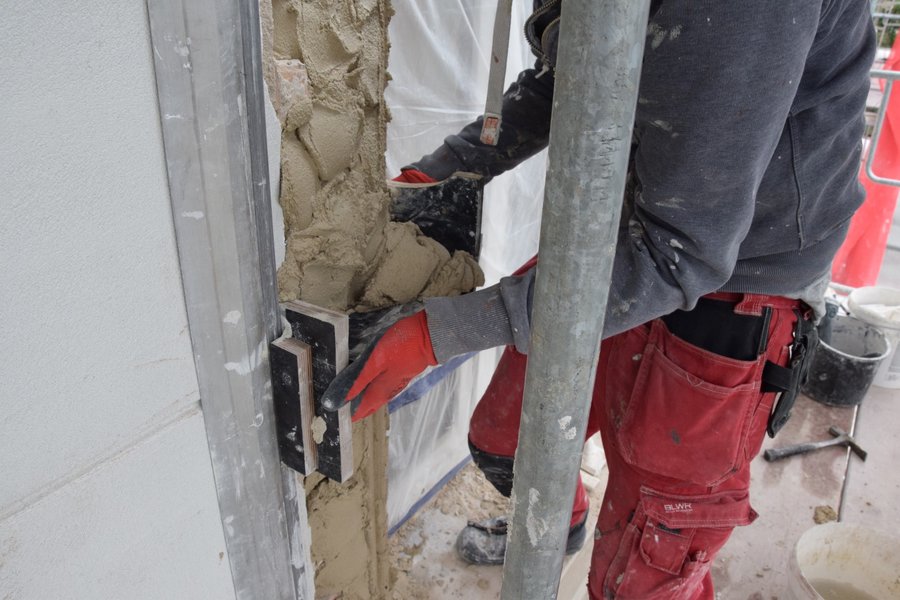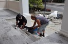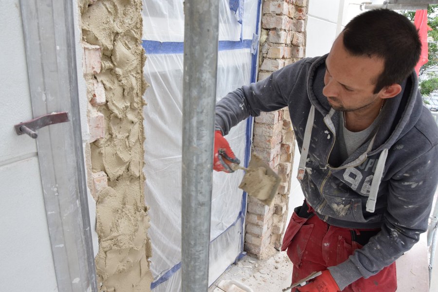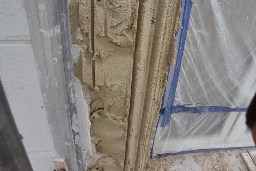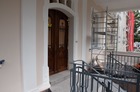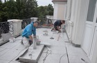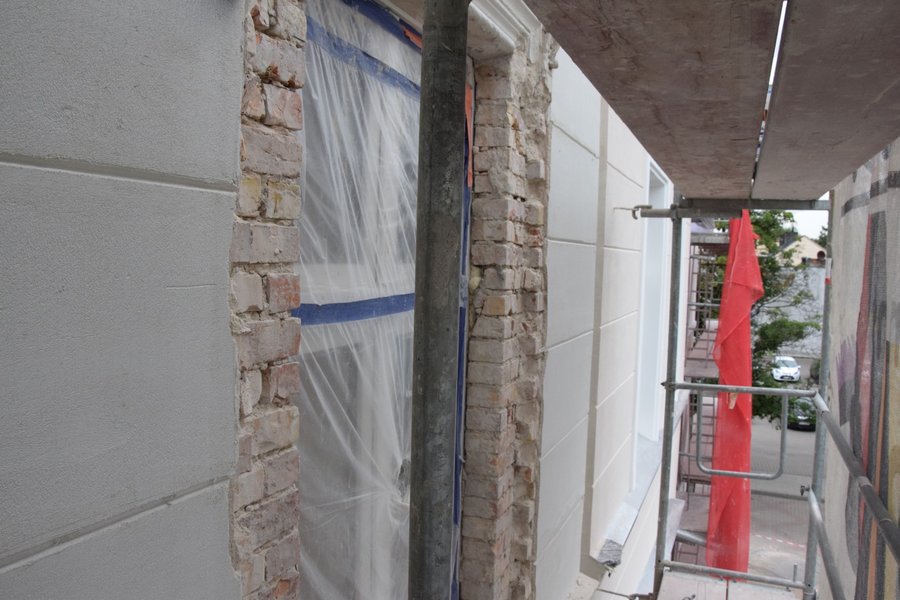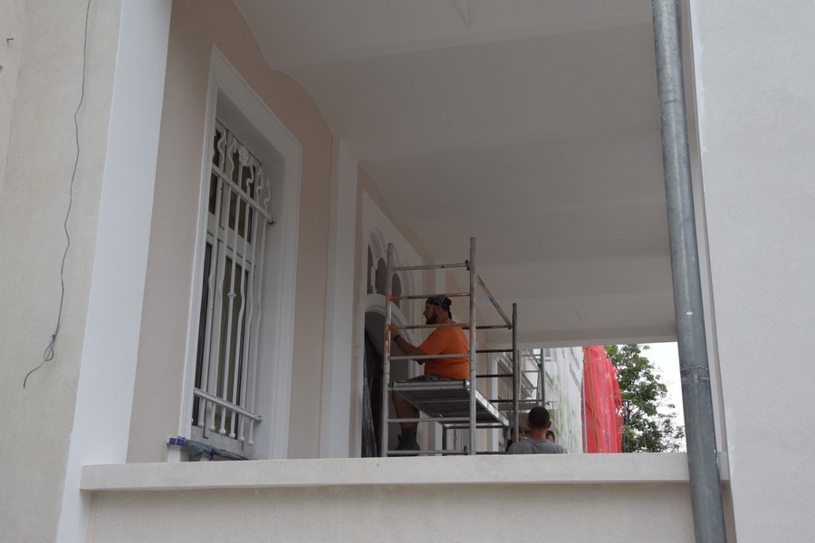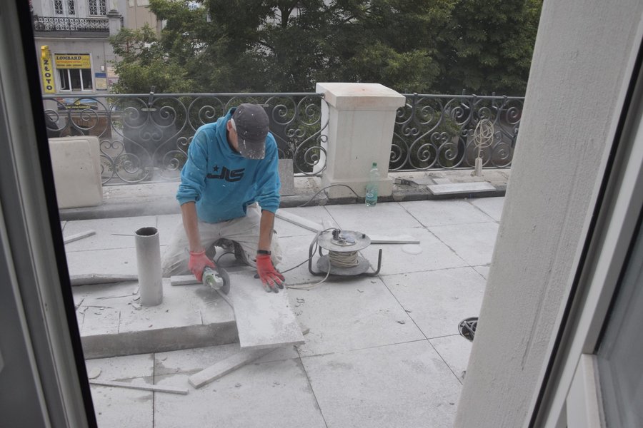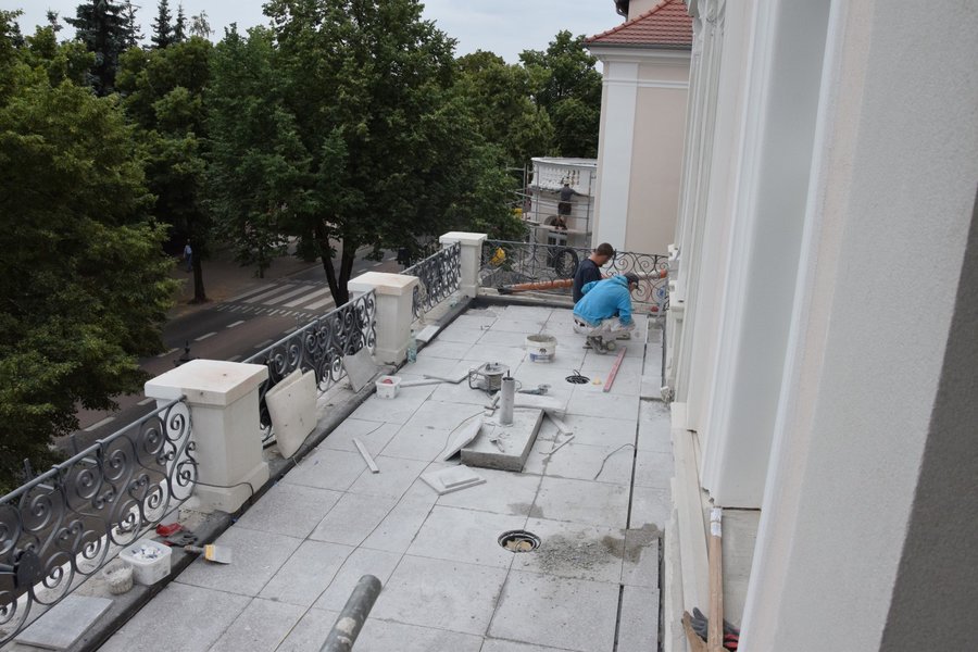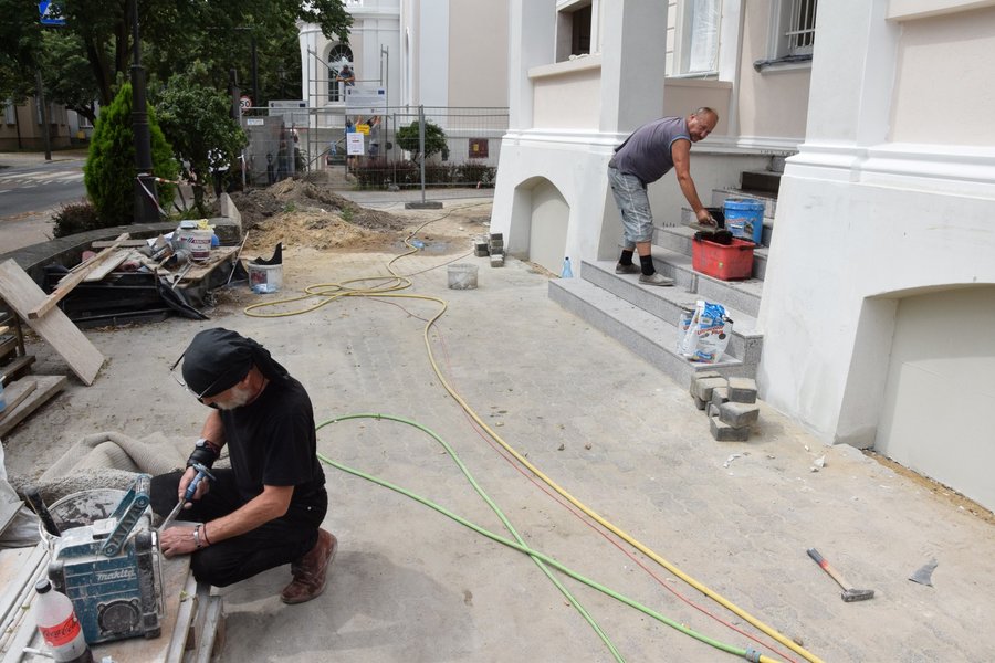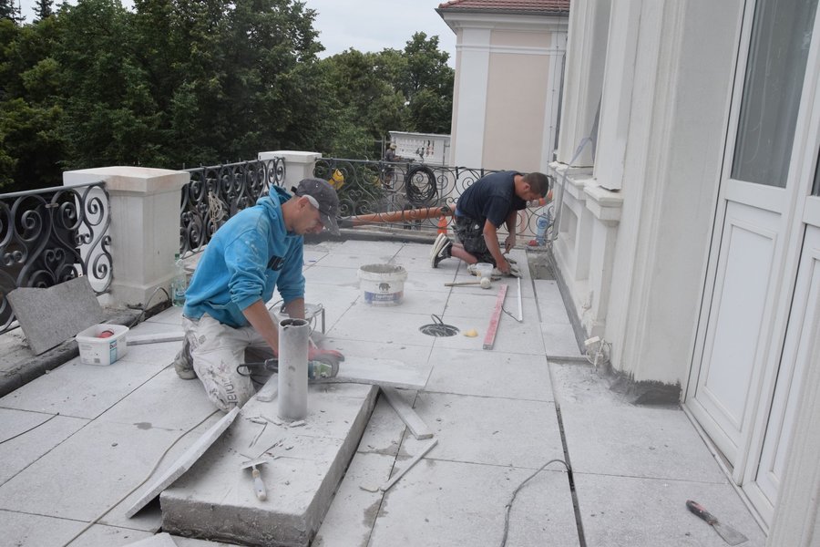 Trwają także prace na głównym tarasie budynku. Usunięto starą posadzkę. Trwa układanie granitowych płyt i montaż lamp. Poza tym na prawej stronie frontowej ściany budynku trwają prace przy odtwarzaniu dekoracji sztukatorskich i obramowań okiennych, których kształt ustalono w oparciu o stare tynki.