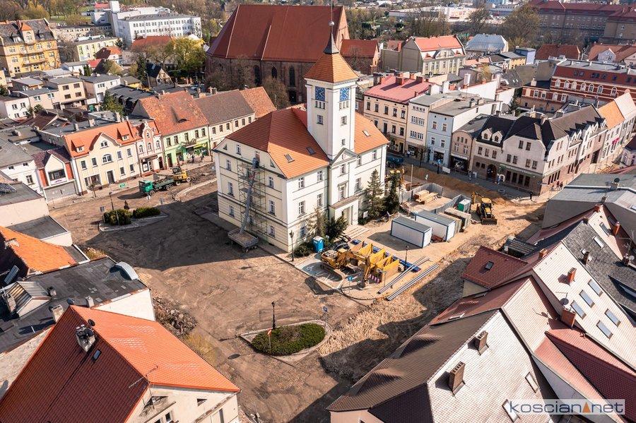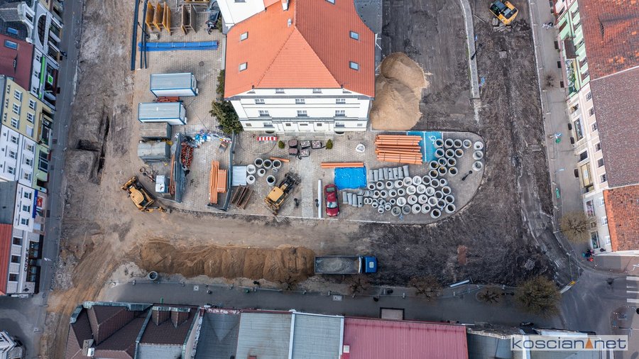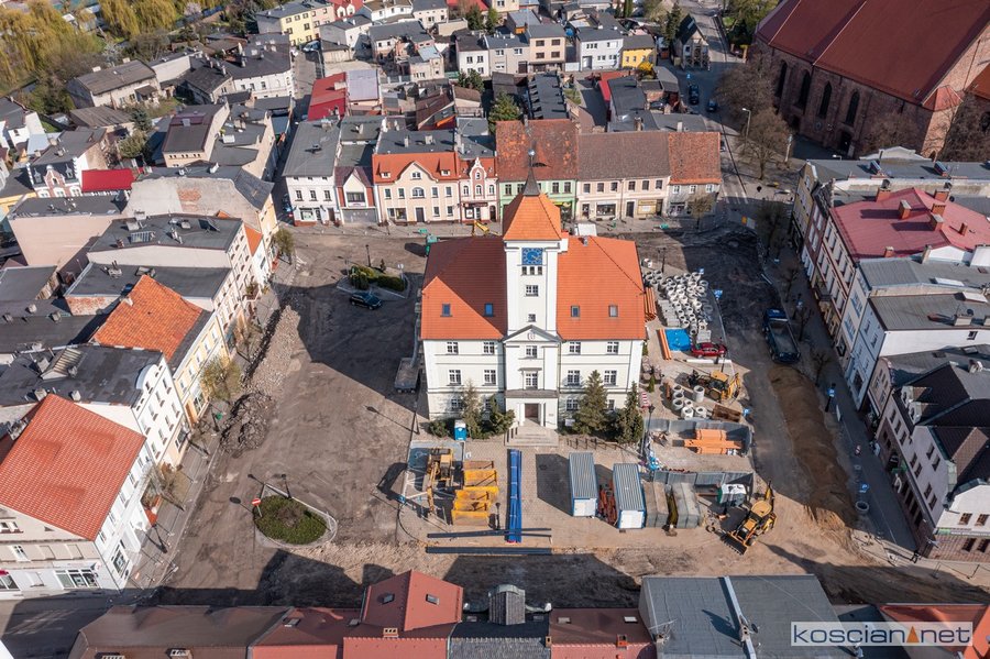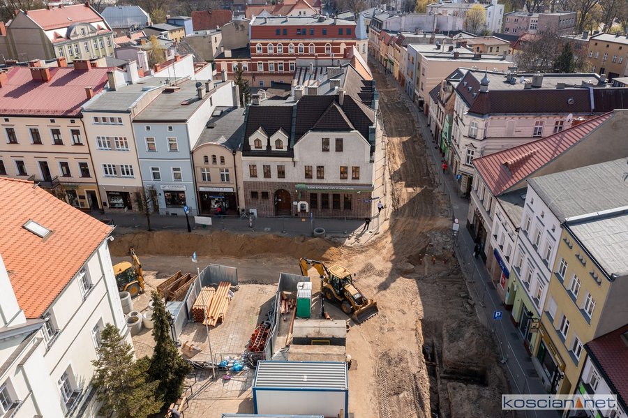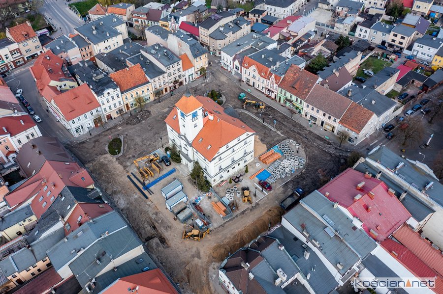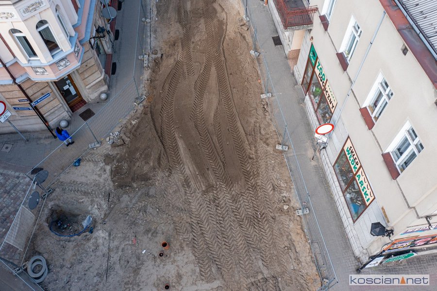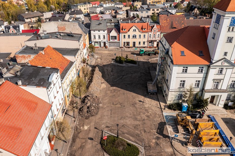 Jak widać na zdjęciach z drona z całej płyty Rynku usunięto asfalt, a z części także zalegającą pod nim kostkę brukową. Po wymianie podziemnej infrastruktury plac zostanie wyłożony granitową nawierzchnią. Rewitalizacja Rynku i ulicy Wrocławskiej ma się zakończyć w czwartym kwartale bieżącego roku.