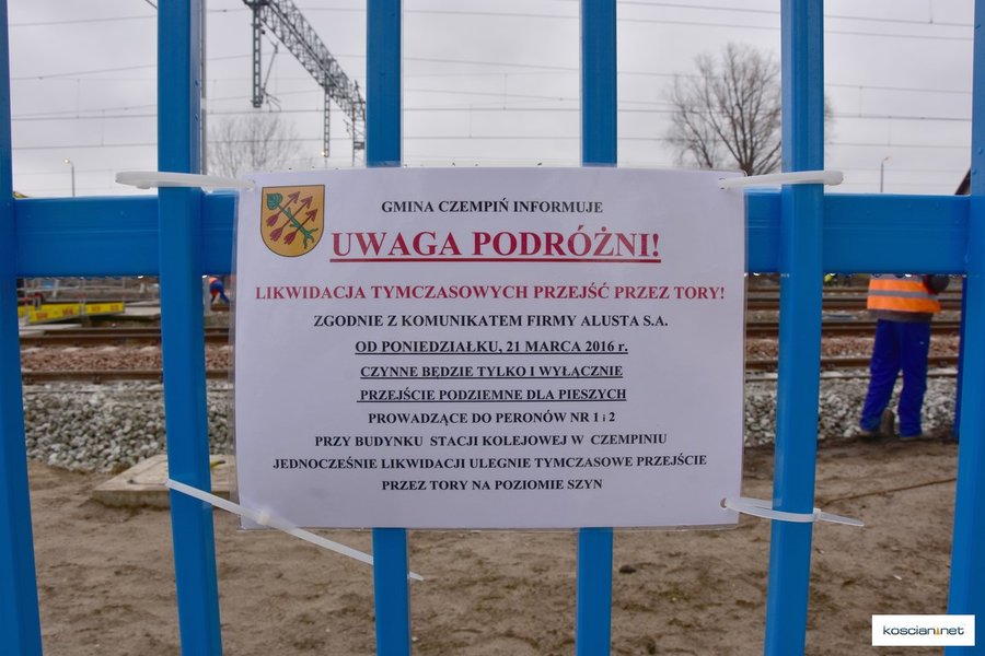 Budowa podziemnego przejścia i peronów w Czempiniu wpisuje się w kompleksową modernizacje linii kolejowej E59 Poznań Wrocław. Jako pierwsi z nowego przejścia skorzystali podróżni z pociągu relacji Poznań -Wrocław, który dotarł do Czempinia o godz 11.36. Przejście z szerokimi schodami wyposażone jest także w windy. Tym samym zamknięto funkcjonujące od pół roku tymczasowe przejścia na peron na poziomie szyn.