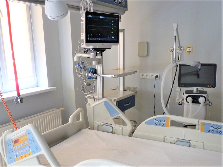- łóżko szpitalne do intensywnej terapii (posiada wbudowany system ważenia pacjenta oraz regulację do przechyłów bocznych),