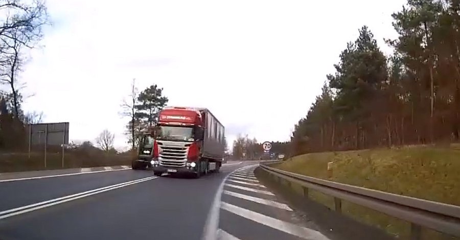 Kamera samochodowa zamontowana w osobowym aucie zarejestrowała zdarzenie, do którego doszło w czwartek, 1 lutego, na drodze krajowej numer 5 przed wjazdem na obwodnicę Śmigla. Na nagraniu widać, jak ciągnik siodłowy z naczepą wyprzedza inny pojazd pomimo podwójnej linii ciągłej. Auto, w którym zamontowana była kamera, aby uniknąć czołowego zderzenia musiało zjechać na pobocze.