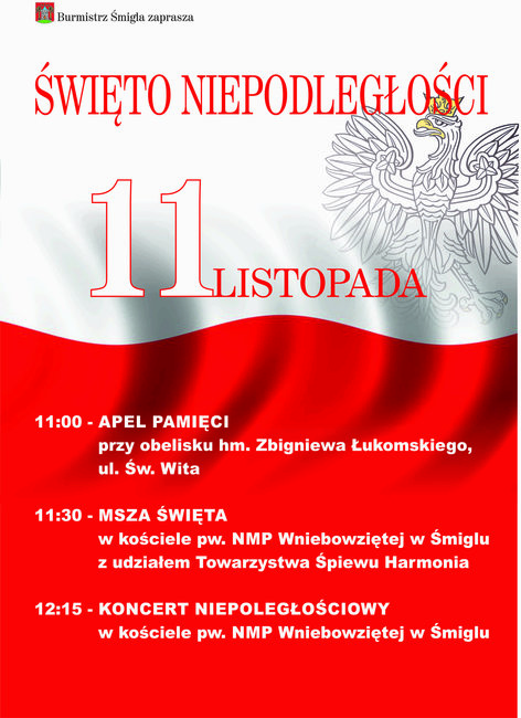 Obchody rozpoczną się o godz. 11. przy pomniku harcmistrza Zbigniewa Łukomskiego odbędzie się Apel Pamięci. Na godz. 11.30 zaplanowano mszę w śmigielskiej farze. Po nabożeństwie rozpocznie się koncert niepodległościowy.
