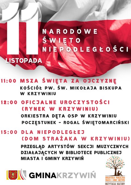 Obchody 103. rocznicy odzyskania przez Polskę niepodległości zainauguruje msza za Ojczyznę w miejscowym kościele. Nabożeństwo rozpocznie się o godz. 11. Na godz. 12 zaplanowano uroczystości na Rynku. Zagra tam Orkiestra Dęta OSP Krzywiń. Na uczestników czekać będą Rogale Marcińskie. O godz. 15 w krzywińskim Domu Strażaka odbędzie się koncert „Dla Niepodległej”. Wystąpią członkowie sekcji muzycznych działających w Bibliotece Miasta i Gminy Krzywiń. Natomiast 20 listopada Orkiestra Ochotniczej Straży Pożarnej w Krzywiniu zaprasza na koncert „Bitwy w historii Polski prowadzące do odzyskania niepodległości”. Muzyczne wydarzenie zaplanowano na godz. 17 w Domu Strażaka w Krzywiniu. Orkiestrze towarzyszyć będą: Agnieszka Szymańska i Sławomir Olgierd Kramm. Koncert poprowadzi miłośnik historii, redaktor radia MC Poznań Leszek Łukomski.