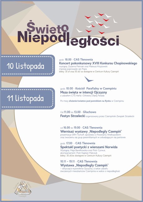 11 listopada o godz. 10 w czempińskim kościele odprawiona zostanie msza za Ojczyznę z udziałem chóru Harfa i Orkiestry Dętej Parada. Po jej zakończeniu odbędzie się uroczystość na Rynku. W godz. 11 – 13 w Głuchowie trwać będzie Festyn Strzelecki przygotowany przez Czempiński Związek Strzelecki. Na godz. 16 zaplanowano wernisaż wystawy „Niepodległy Czempiń” w Izbie Muzealnej w „Tlenowni” „ Na godz. 17 Centrum Kultury zaprasza na spektakl „Norwid”. W „Tlenowni” wystąpią: Maja Barełkowska, Piotr Cyrwus i Piotr Kajetan Matczuk. Podzielą się ze słuchaczami pięknem i mistrzostwem frazy poety. Bilety na to wydarzenie w cenie 30 złotych dostępne są w Centrum Kultury.
