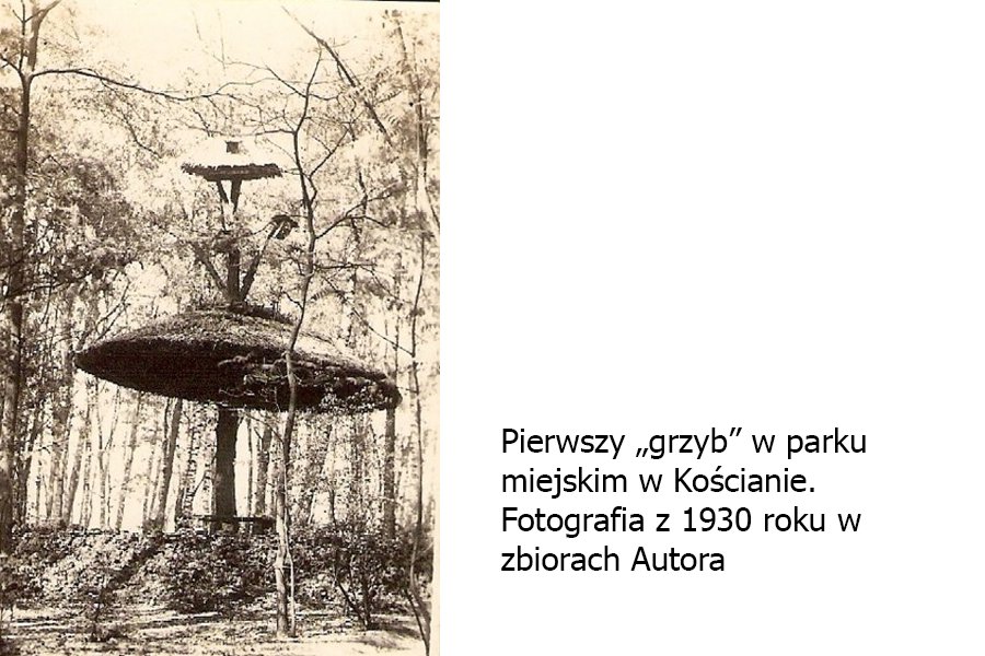 Wawrzyniak – człowiek światły i w świecie bywały – widział podobne parkowe instalacje w Niemczech, gdzie służyły do ochrony spacerowiczów przez deszczem i słońcem. Wspominał, że podobne „grzybki” oglądał pod Berlinem i w Tarnowskich Górach. Sprzymierzeńca zyskał w wiceburmistrzu, który był architektem i budowniczym. Projekt pierwszego kościańskiego „grzybka” wyszedł więc z pracowni Włoszkiewicza i – na dodatek – projektant sam, w darze dla miasta, sfinansował budowę. Pomysł był następujący: na stare uschnięte (po uderzeniu pioruna) drzewo nałożono drewnianą konstrukcję kapelusza „grzyba”, nakrytą strzechą z trzciny; pod nią ustawiono ławeczkę w kształcie koła, a nad nią urządzono gniazdowisko i domki dla ptaków. Małpi Gaj z miejsca tragicznego stawał się miejscem magicznym. Strach strachem, ale pomysł spodobał się ludziom. Najchętniej spotykali się pod „grzybkiem” zakochani, wycinając scyzorykami serduszka, imiona i daty. Nikomu nie przeszkadzało, że nadal - co dwa lata - zdarzały się w tym miejscu samobójstwa przez powieszenie; z ławki łatwo można było zarzucić sznur na przęsła konstrukcji.