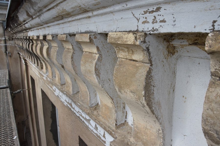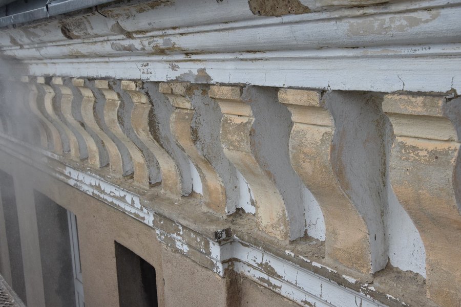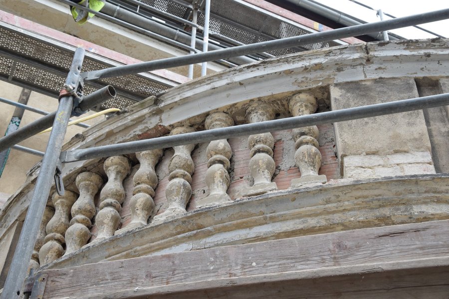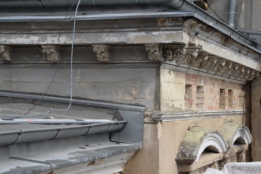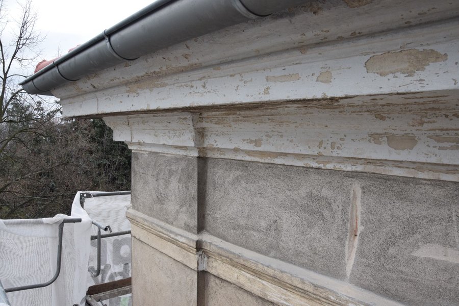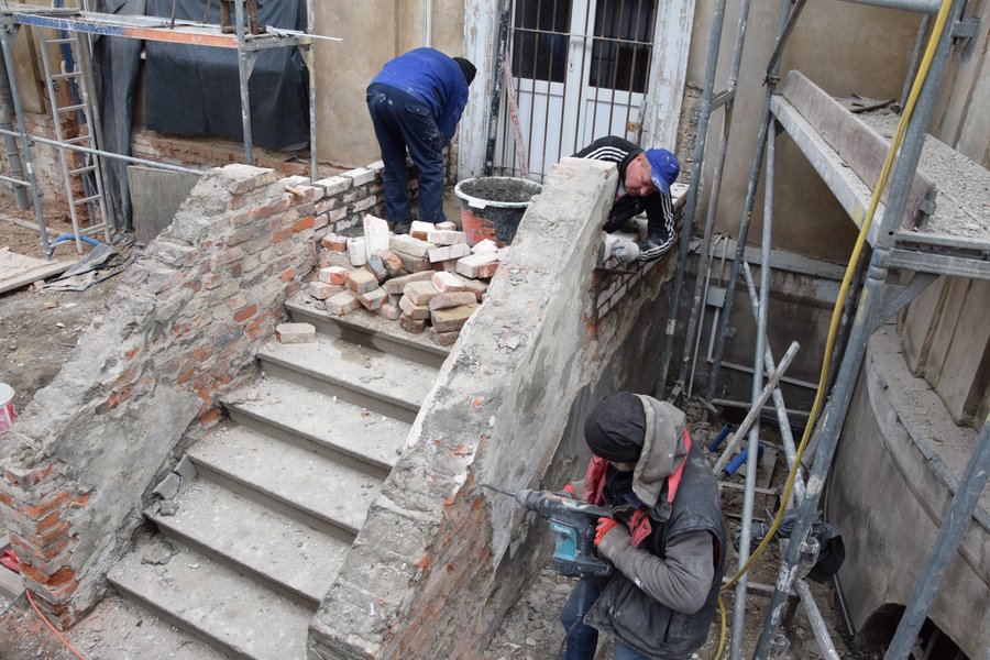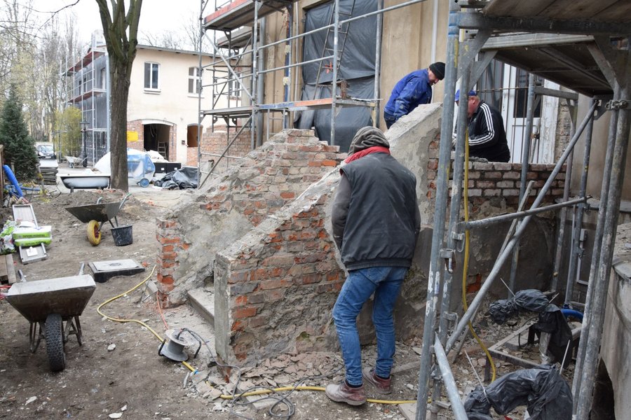 Oczyszczane są elementy sztukatorskie elewacji, które zostaną uzupełnione i naprawione. Podczas usuwania zewnętrznej warstwy tynków pojawiły się elementy dekoracyjne, których wcześniej nie było widać. Odbudowywane są także schody z ogrodu prowadzące do dawnego mieszkania Starosty Kościańskiego.