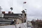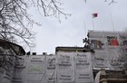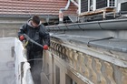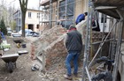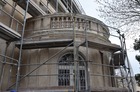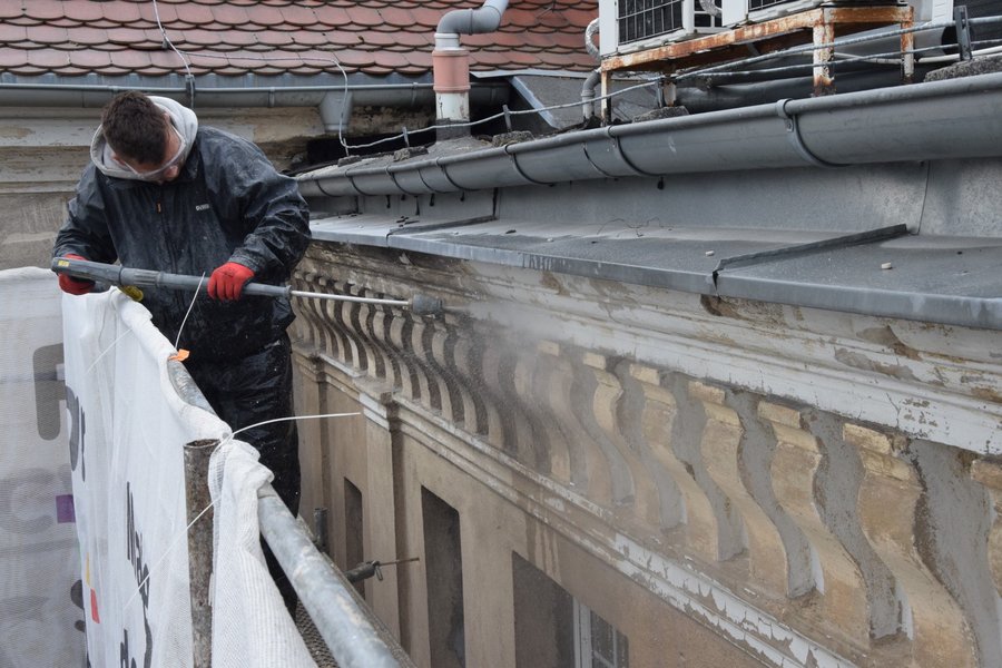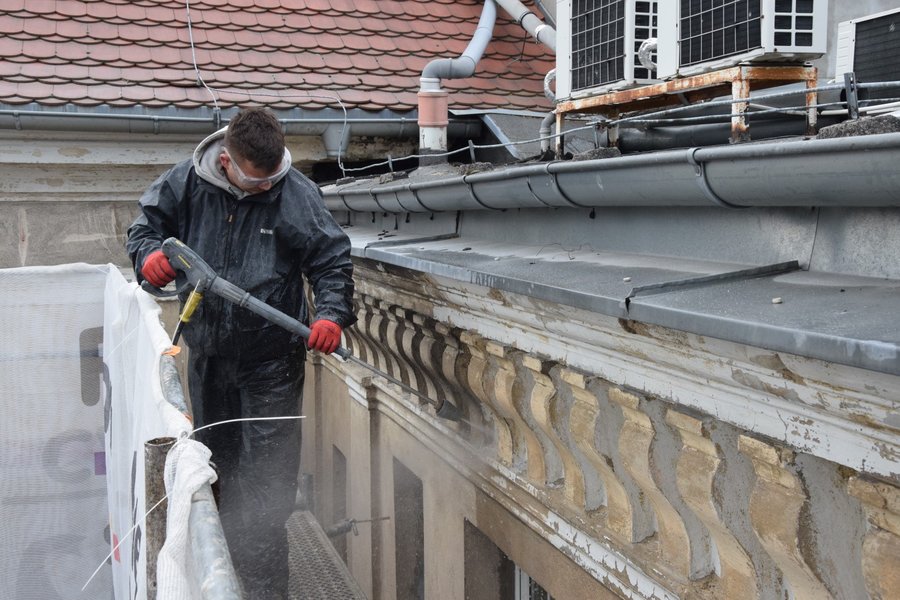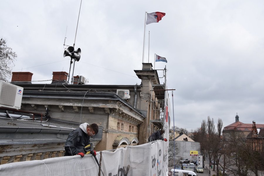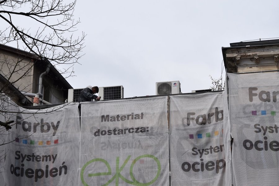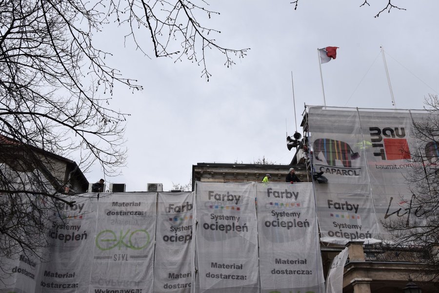 Trwają prace przy oczyszczaniu frontowej ściany siedziby magistratu i starostwa powiatowego w Kościanie.