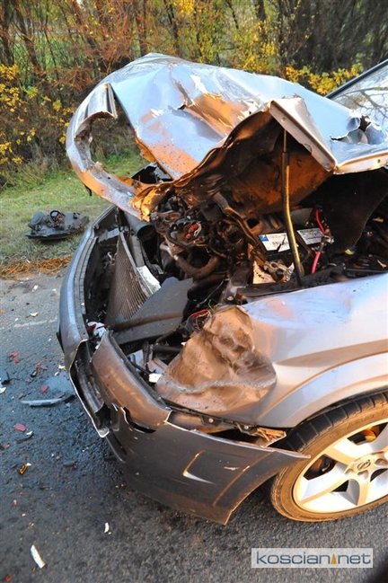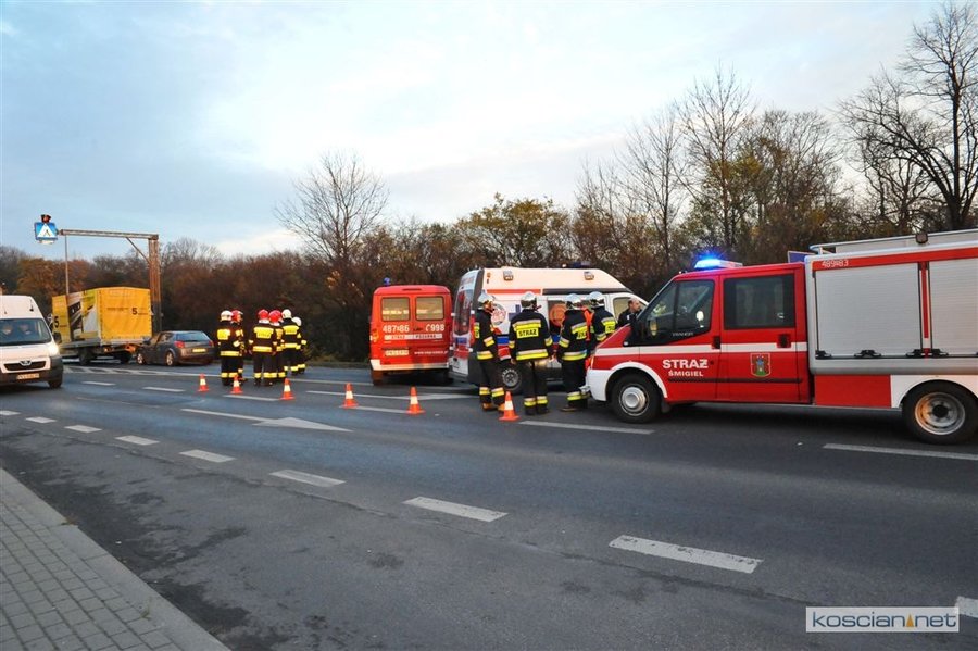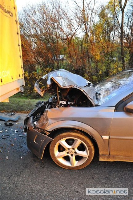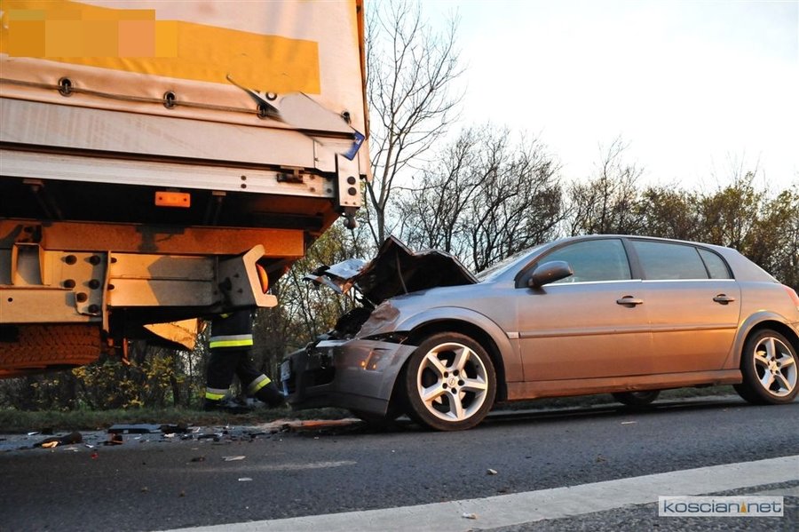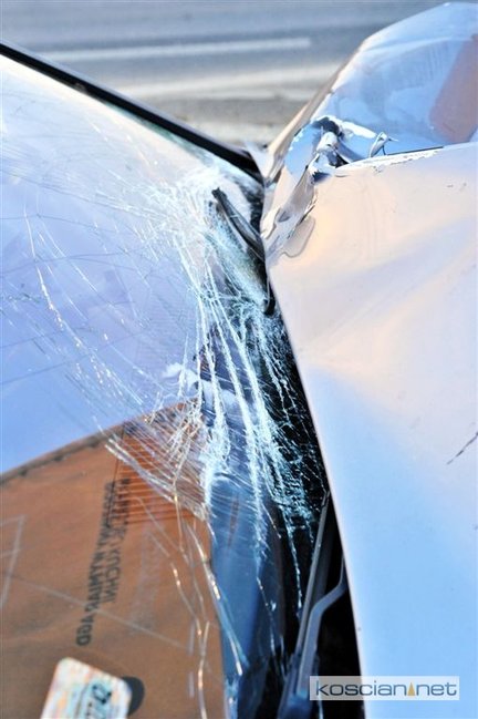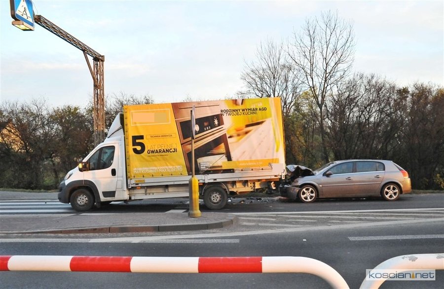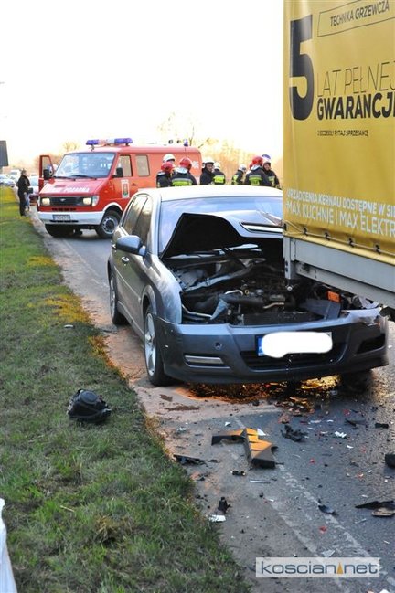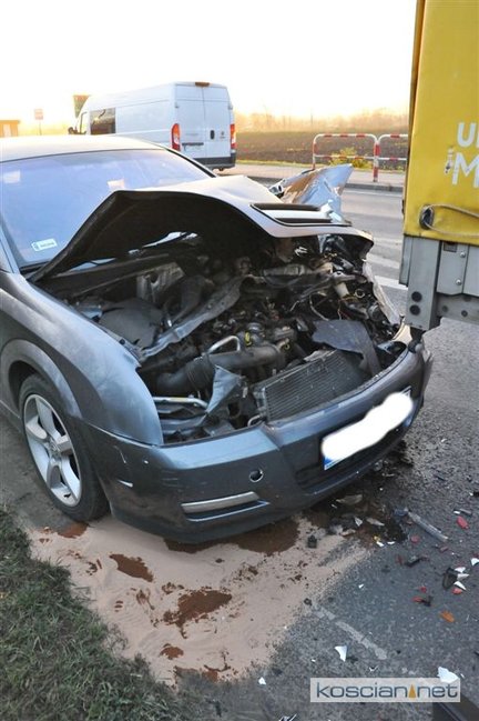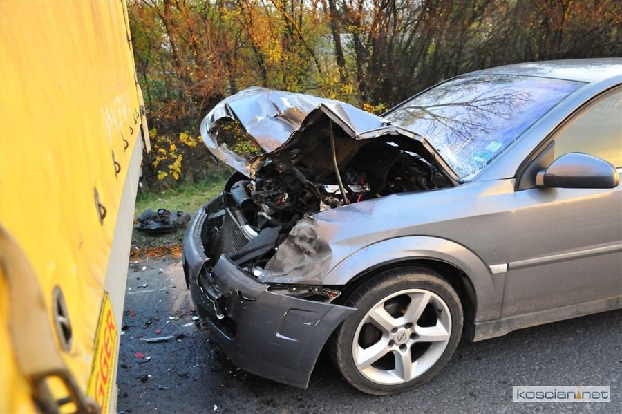 Kierujący oplem nie zachował bezpiecznej odległości od poprzedzającego go pojazdu i najechał na tył dostawczego peugeota. Kierowcę osobówki przetransportowano do kościańskiego szpitala.