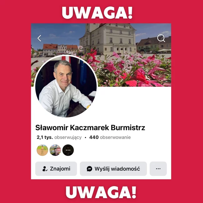 Podróbka konta funkcjonuje pod nazwą „Sławomir Kaczmarek Burmistrz”, podczas gdy prawdziwy profil burmistrza to „Sławomir Kaczmarek – Burmistrz Miasta Kościana”. Warto więc przed akceptacją zaproszenia zweryfikować, z kim naprawdę macie do czynienia.