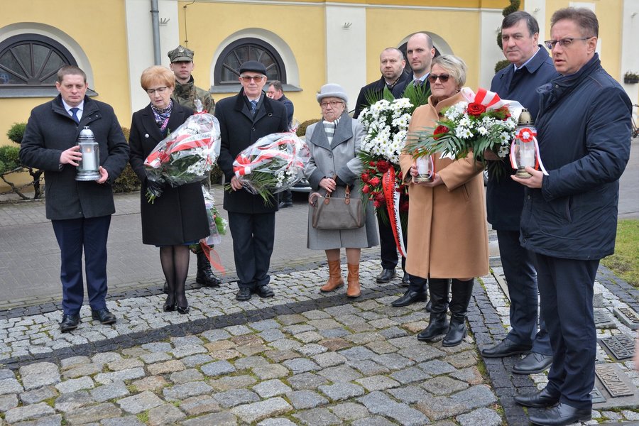 Samorządowcy, kombatanci i członkowie stowarzyszenia historycznego złożyli wiązanki kwiatów pod tablicą poświęconą Żołnierzom Wyklętym