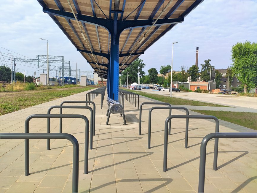 Przy stojakach na rowery ustawiono zabytkową wiatę z kościańskiego peronu. Odnowione pod nadzorem konserwatora zabytków stalowe konstrukcje dziesięciu podpór mają nowe poszycie. Wiata nawiązuje do historii stacji i dobrze będzie służyć rowerzystom.