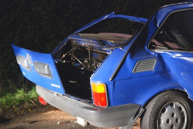 Fiat 126 p wyjeżdżając z posesji na ,,piątkę’’ nie ustąpił pierwszeństwa jadącemu drogą peugeotowi. Siła uderzenia dosłownie rozerwała fiata na dwie części.