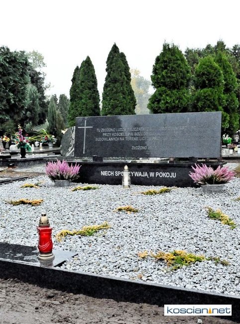 Do zbiorowej mogiły złożono pięćdziesiąt skrzyń z kośćmi wydobytymi podczas ekshumacji cmentarza odkrytego w trakcie budowy boiska za budynkiem I LO w Kościanie. Odkryto tam ponad tysiąc osiemdziesiąt pochówków dokonanych w okresie od późnego średniowiecza do początków XVIII wieku. Cały materiał kostny poddano analizie antropologicznej określając wiek pochowanych osób. Prawie czterdzieści trzy procent stanowiły dzieci w wieku od roku do sześciu lat.