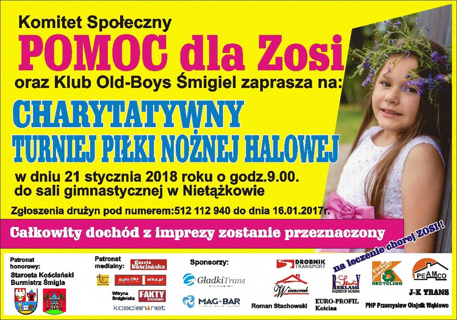 W Śmiglu powstał Społeczny Komitet Pomoc dla Zosi. W najbliższą niedzielę, 21 stycznia wspólnie z Klubem Old Boys Śmigiel zorganizuje Charytatywny Turniej Piłki Nożnej Halowej. Rozgrywki rozpoczną się o godz. 9 w sali sportowej w Nietążkowie. Do rywalizacji przystąpi 16 zespołów. Mile widziani są kibice. Z myślą o nich organizatorzy przygotowują kilka atrakcji. Dochód z imprezy zostanie przeznaczony na leczenie dziewczynki. Turniej honorowym patronatem objęli burmistrz Śmigla i Starosta Kościański.