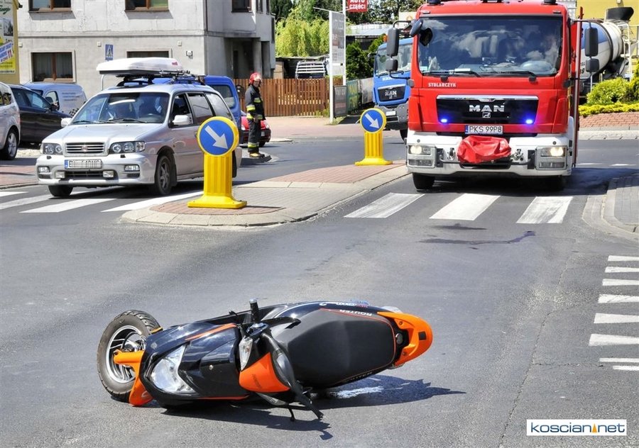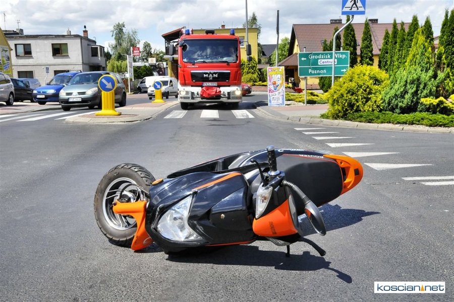 Do zdarzenia doszło około godziny 13.00. Jadący w kierunku ronda 79-letni motorowerzysta uderzył w tylne koło wyjeżdżającego z ulicy Czempińskiej forda kierowanego przez 36-letniego mieszkańca Kościana. Motorowerzystę – mieszkańca gminy Czempiń – przewieziono do szpitala na badanie.