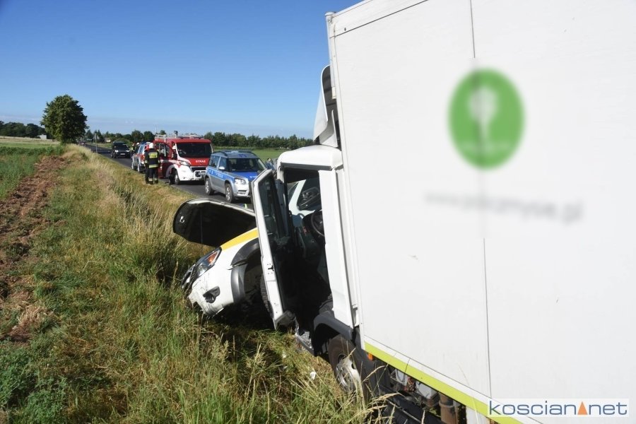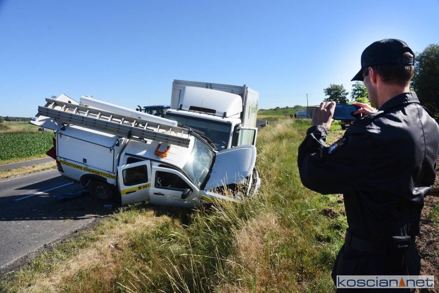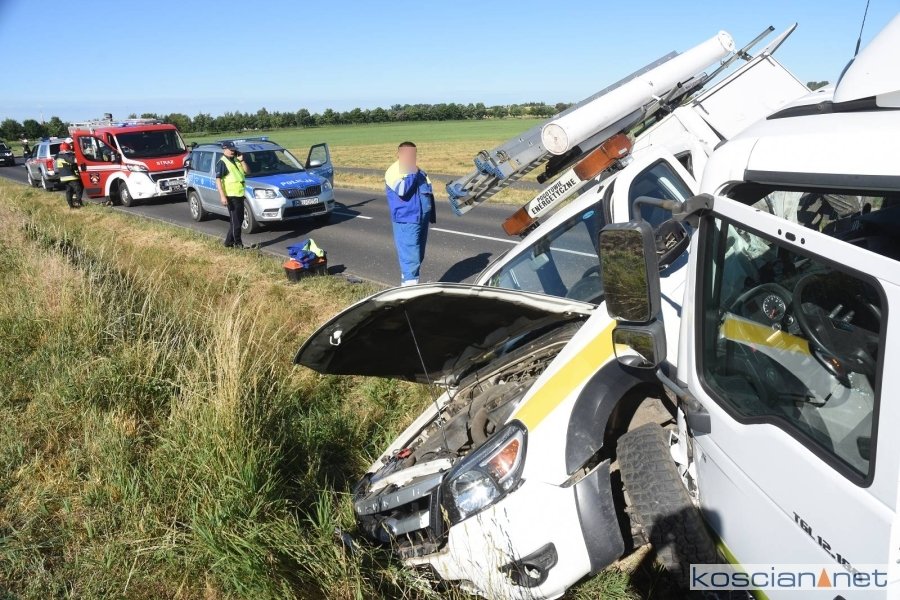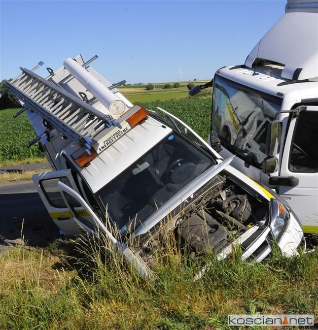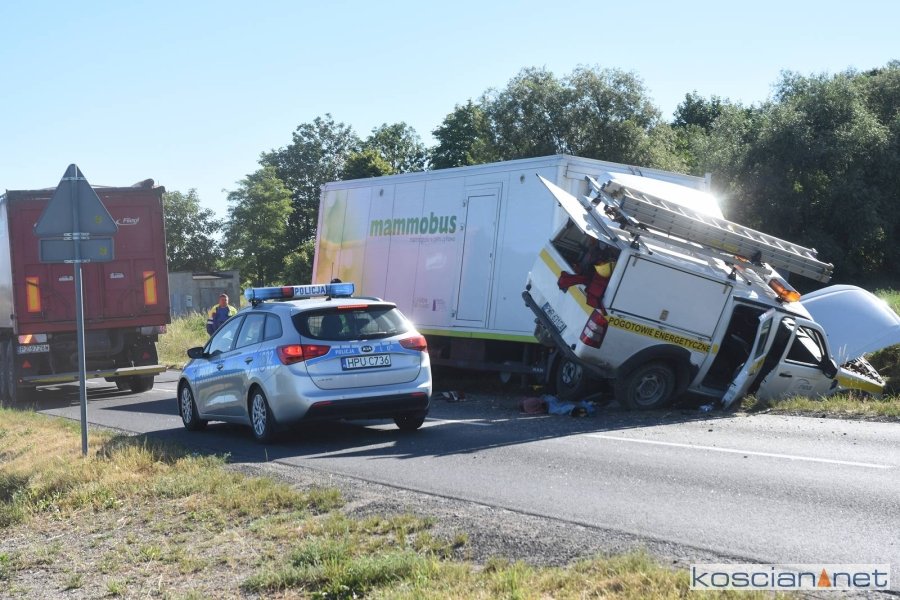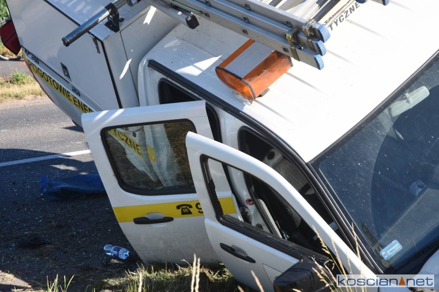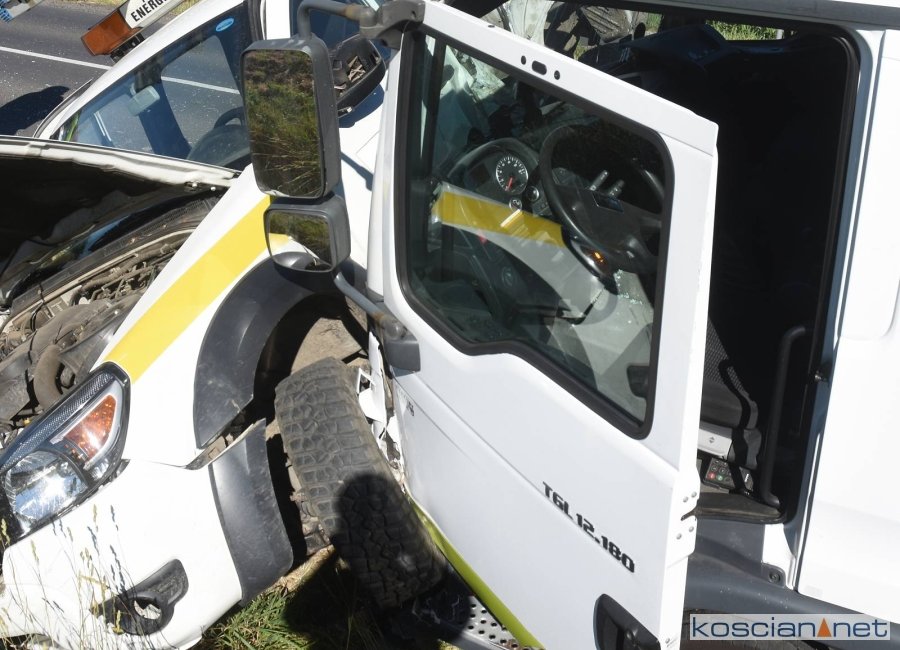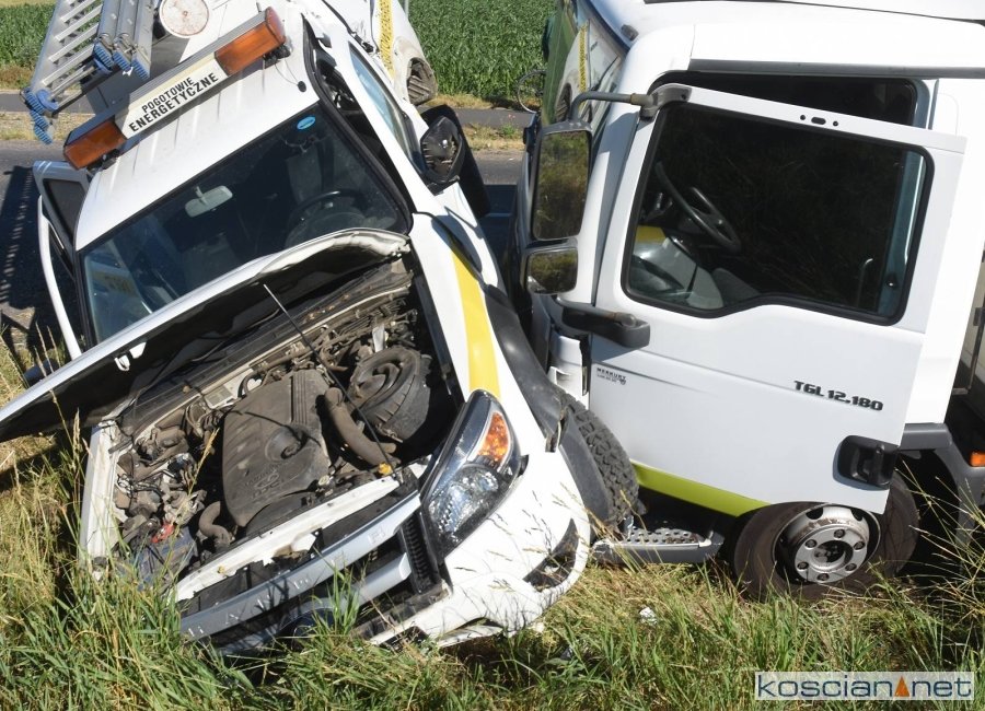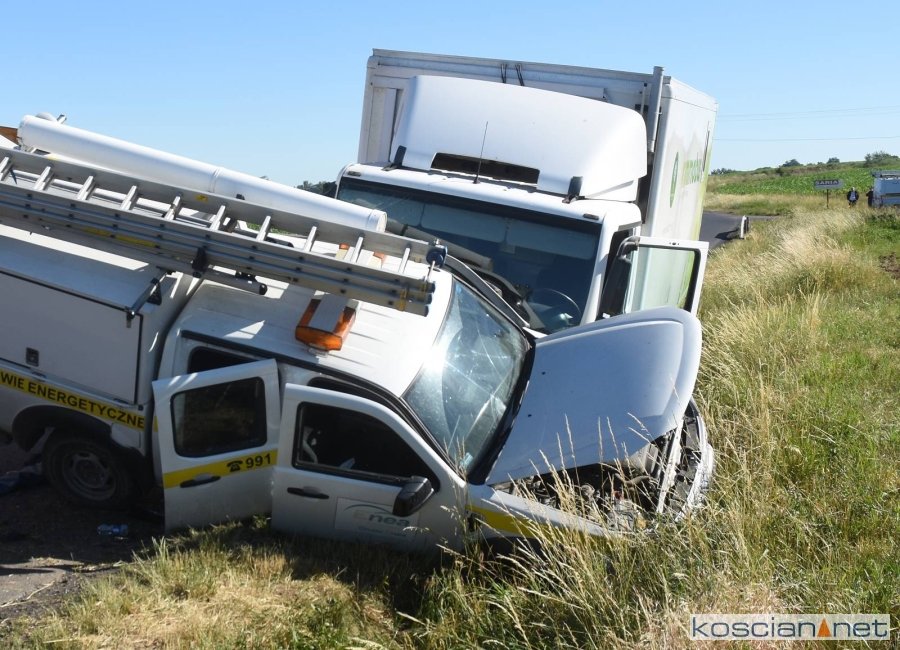 Do wypadku doszło 6 czerwca około godziny 8.00. Dwie osoby uwięzione w samochodzie pogotowia energetycznego wydobyli strażacy z PSP Kościan i OSP Czempiń. Poszkodowanych przewieziono do szpitala w Kościanie. Okoliczności i przebieg zdarzenia ustala policja.