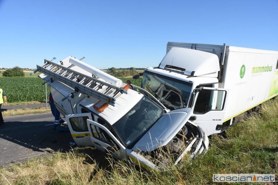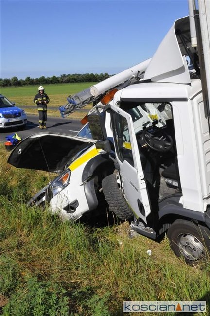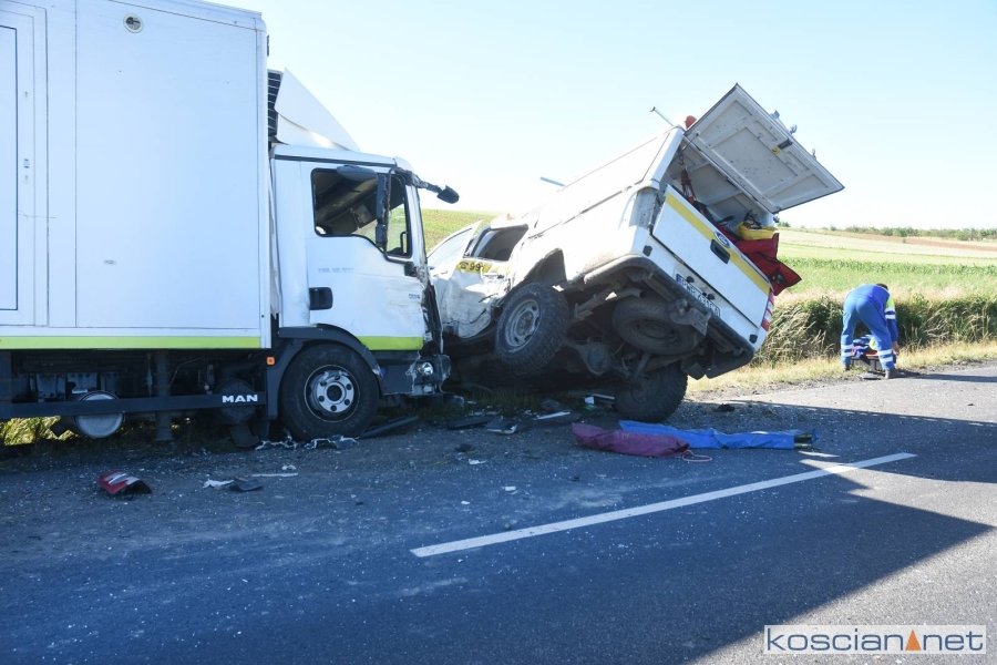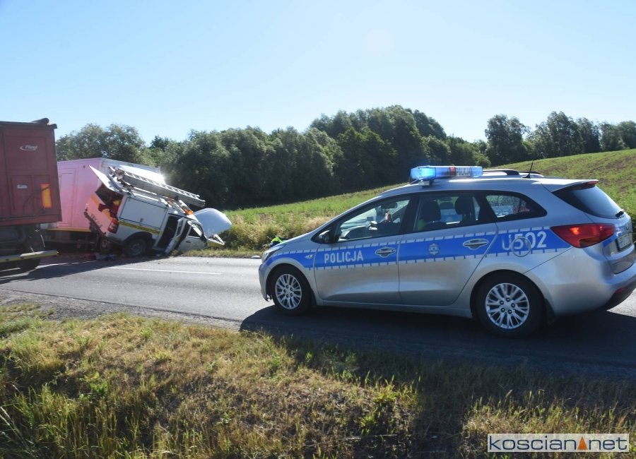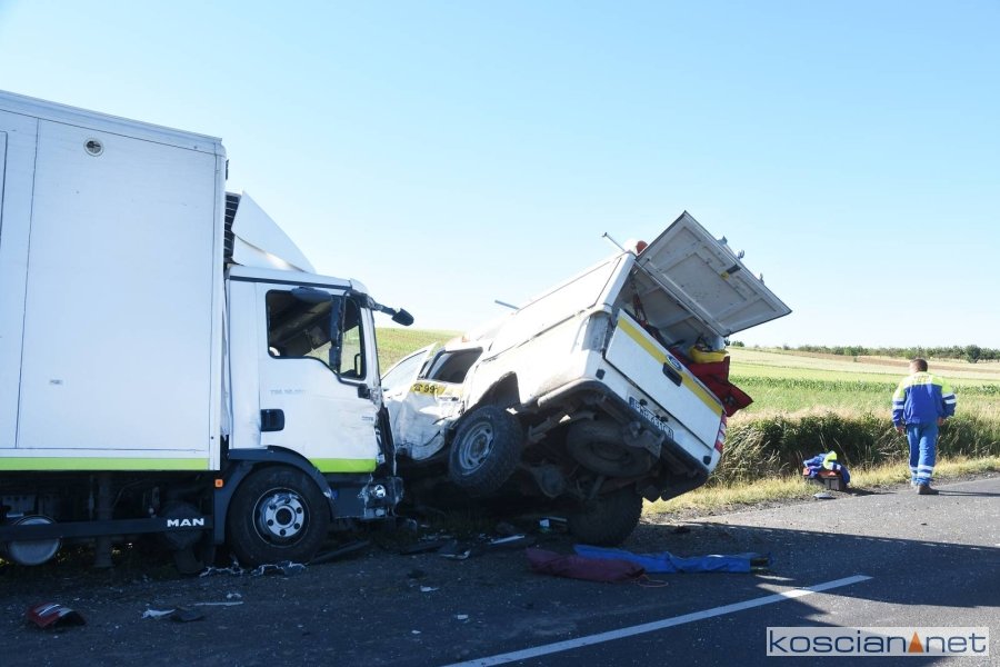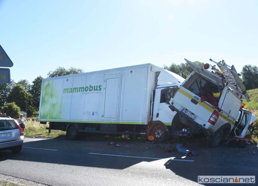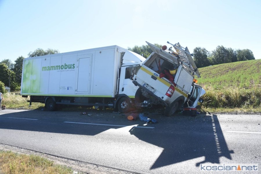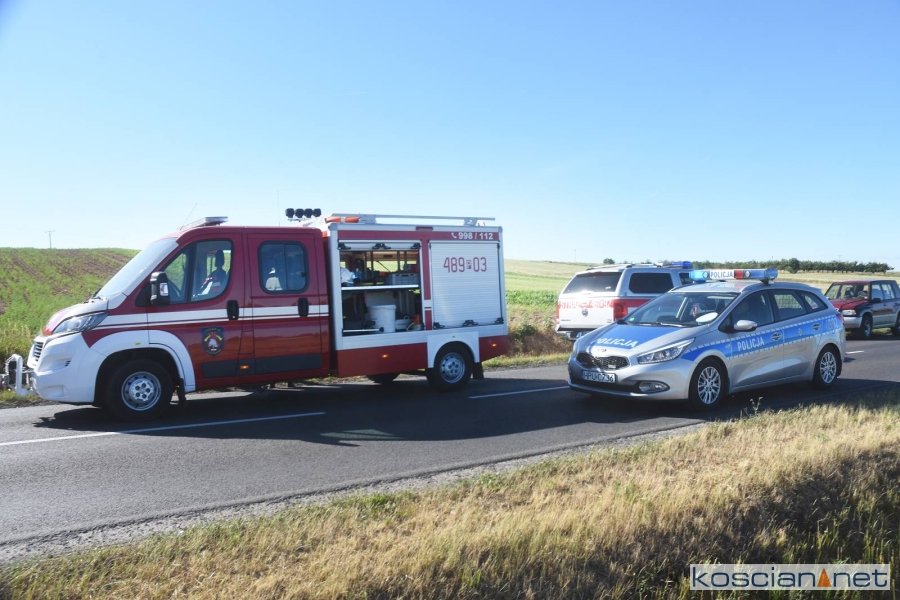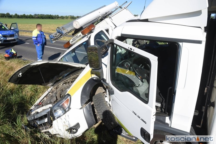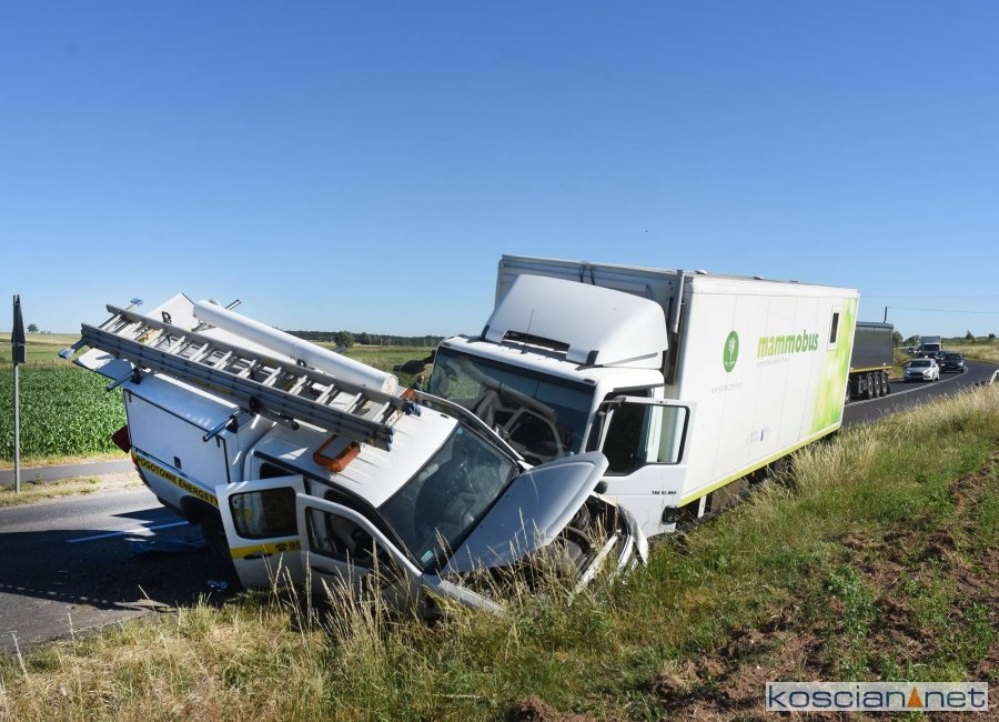 Do wypadku doszło 6 czerwca około godziny 8.00. Dwie osoby uwięzione w samochodzie pogotowia energetycznego wydobyli strażacy z PSP Kościan i OSP Czempiń. Poszkodowanych przewieziono do szpitala w Kościanie. Okoliczności i przebieg zdarzenia ustala policja.