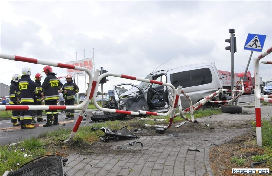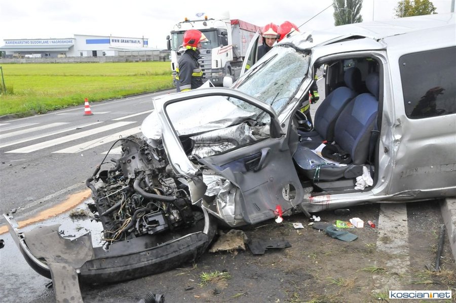 Do zderzenia dwóch pojazdów doszło około godziny 10.00 na skrzyżowaniu drogi krajowej nr 5 z ulicą Sierakowskiego. Jadący od strony Sierakowa citroen berlingo wjechał wprost pod jadącego w kierunku Leszna ciężarowego dafa z naczepą. Siła zderzenia była tak duża, że z osobówki wypadł silnik. Bez szwanku z wypadku wyszedł kierowca tira. Kobietę z samochodu osobowego wydobyli strażacy. Konieczne było użycie narzędzi hydraulicznych. Poszkodowana to 47-letnia mieszkanka gminy Kościan.