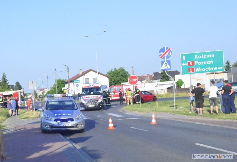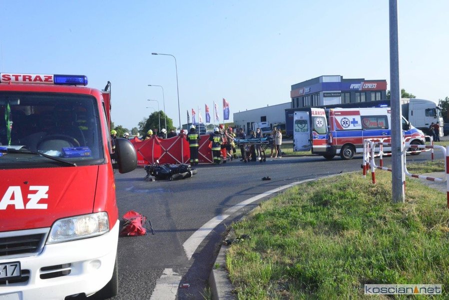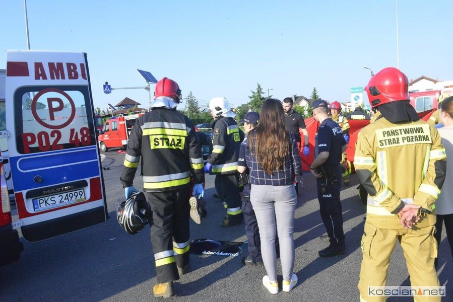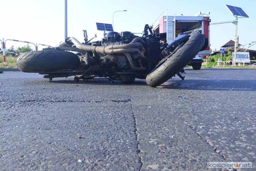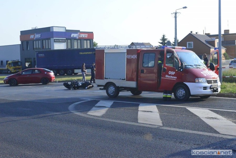 Do zdarzenia doszło w czwartek, 17 czerwca, o godzinie 18.30, na skrzyżowaniu ul. Wielichowskiej z obwodnicą Kościana. Jak wynika ze wstępnych ustaleń 19-latek kierujący audi wjeżdżając z ul. Wielichowskiej na obwodnicę Kościana nie ustąpił pierwszeństwa przejazdu 25-latkowi jadącego motocyklem kawasaki. Motocyklista po zderzeniu z audi uderzył w hondę. Do szpitala odwieziono motocyklistę, który doznał obrażeń nogi.