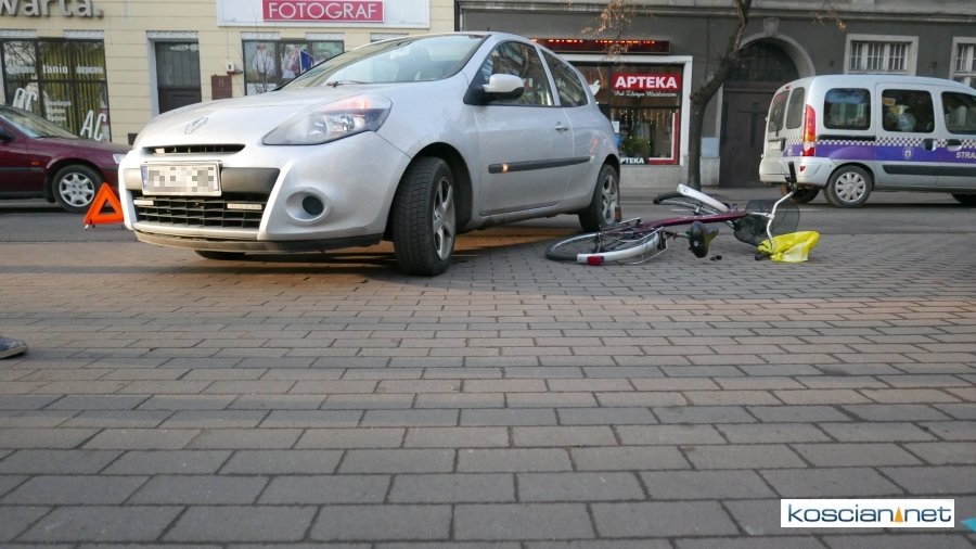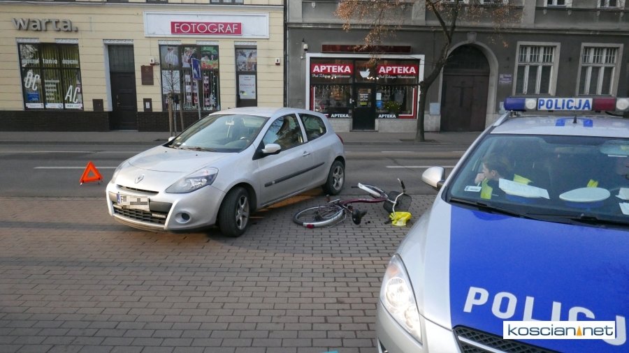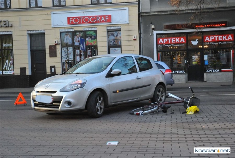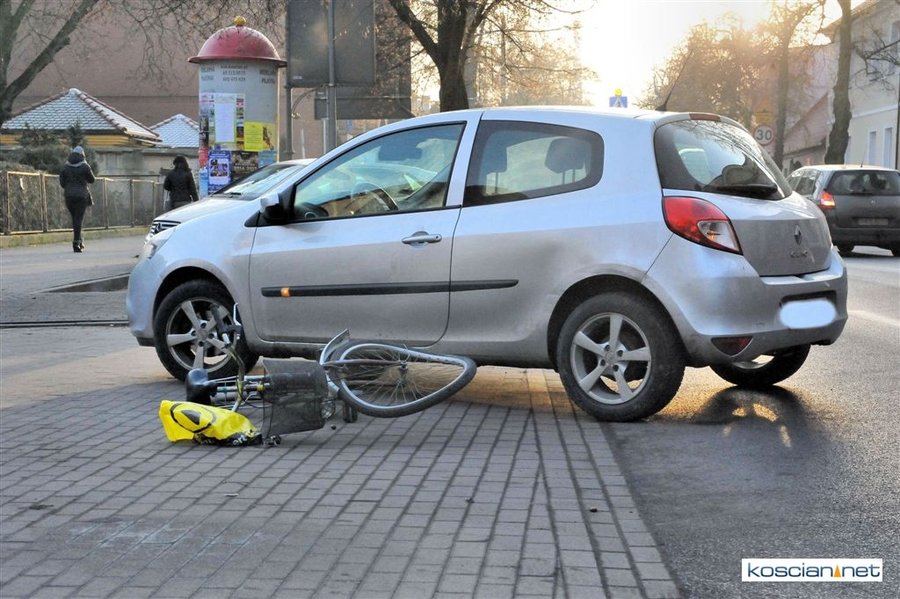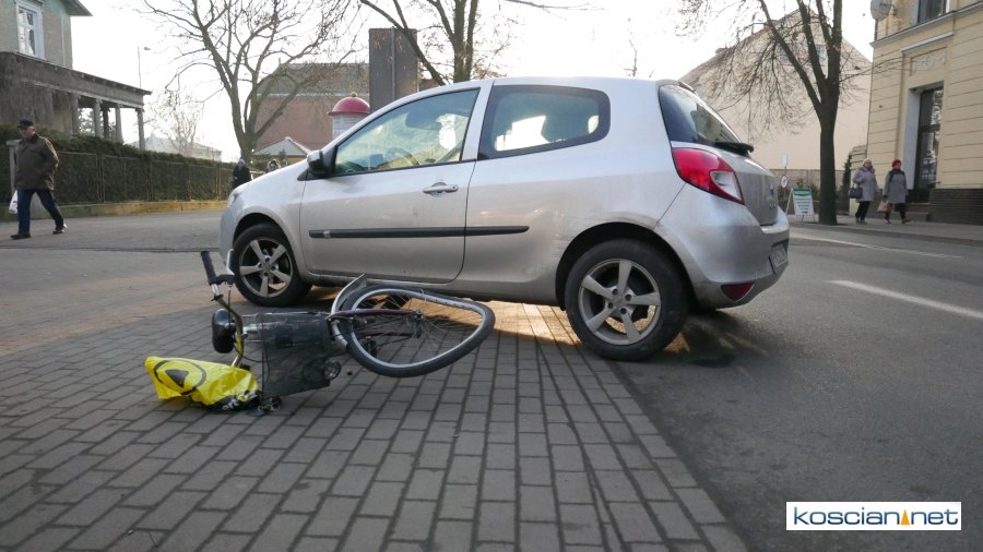 Około godziny 14. kierująca renaultem clio 24-letnia mieszkanka Kościana chciała zjechać z Al. Kościuszki na parking przy I LO w Kościanie. Podczas wykonywania lewoskrętu potrąciła jadącą ścieżką rowerową 67-letnią rowerzystkę. Poszkodowaną przewieziono do kościańskiego szpitala. Kobieta w wypadku złamała lewą nogę. Policja ustala okoliczności wypadku.