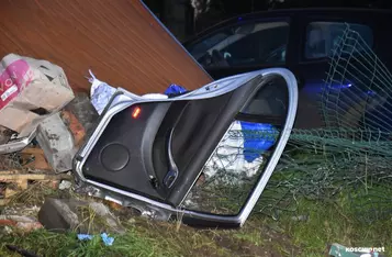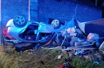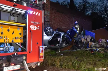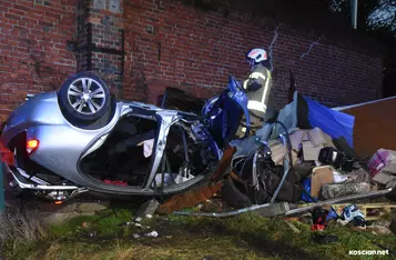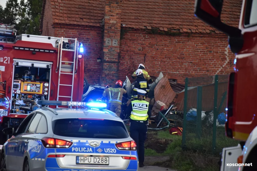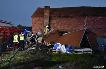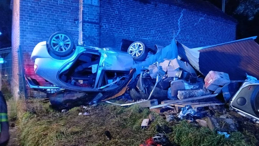 W Wonieściu doszło do poważnego wypadku drogowego. Samochód osobowy wypadł z drogi, staranował ogrodzenie oraz blaszany garaż, po czym zatrzymał się na ścianie budynku gospodarczego.