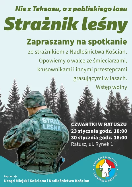 Gościem 28. i 29. „czwartku w ratuszu” będzie Wojciech Włodarczak z posterunku Straży Leśnej Nadleśnictwa Kościan. Opowie o pracy strażników leśnych, których zadaniem jest zwalczanie szkodnictwa leśnego. Dowiemy się jak walczą ze śmieciarzami, kłusownikami i złodziejami grasującymi po lasach. Co wolno robić w lesie, a za co dostaniemy mandat?