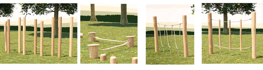 W ramach zamówienia zamontowane zostaną następujące urządzenia: skacząca belka 3-częściowa, wiszące pętle, lina artystyczna, trampolina, waga do chodzenia, belka do balansowania w formie fali , pieńki skośne, belka do balansowania, lina artystyczna kombinacja, lina 3 wiązkowa, pieńki do balansowania z płytą, pieńki zaokrąglone, labirynt do wspinania, girlanda, trawers linowy, wiszące pachołki, pieńki do balansowania, skaczące belki, drążek 3-cześciowy.