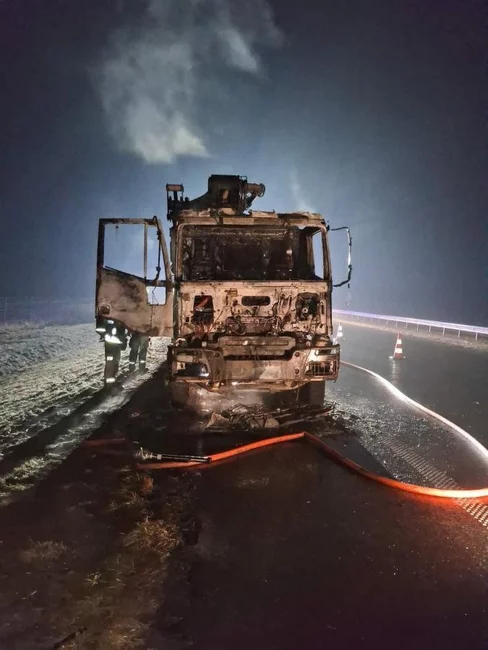 Strażacy podali prądy wody na płonącą kabinę, a po ugaszeniu ognia sprawdzili pojazd kamerą termowizyjną, aby wykluczyć obecność ukrytych zarzewi.