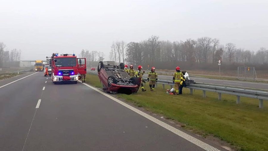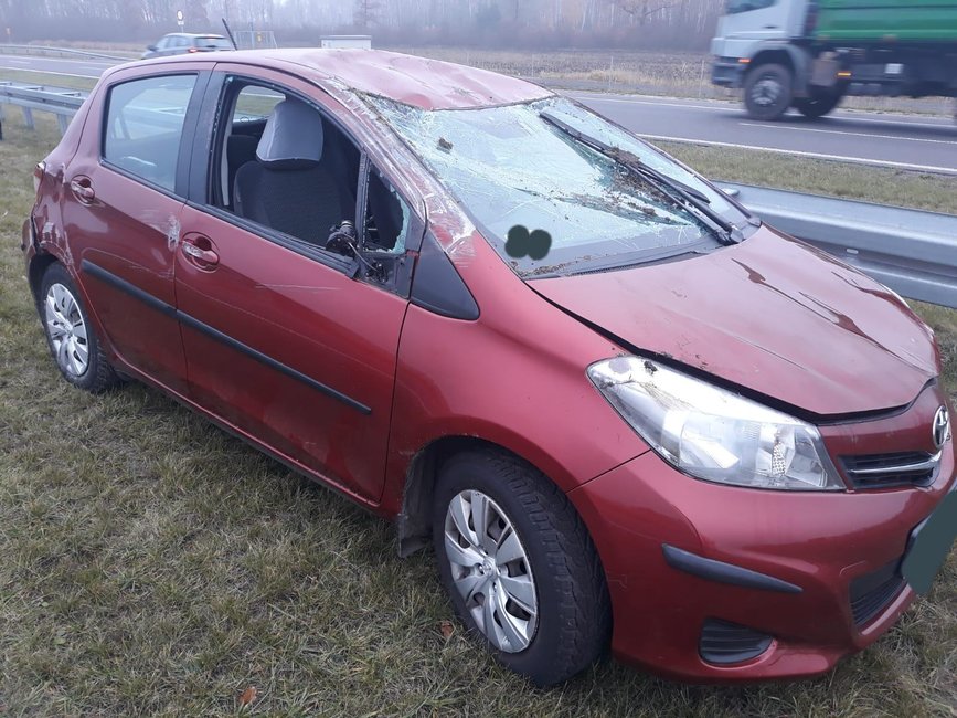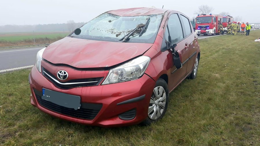 W pobliżu węzła Czempiń dachowała toyota yaris. Do wypadku doszło gdy kierowca próbował przegonić kota, który wskoczył na deskę rozdzielczą.