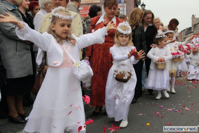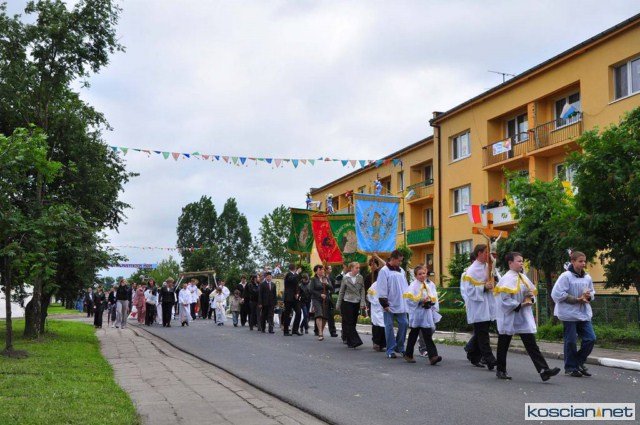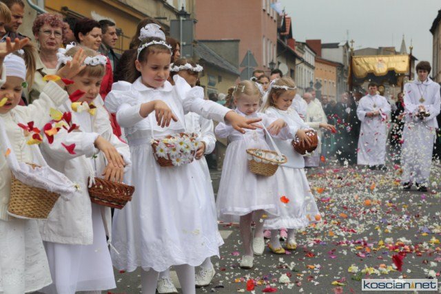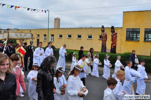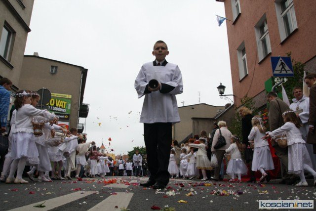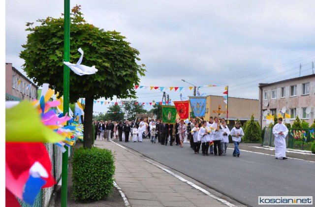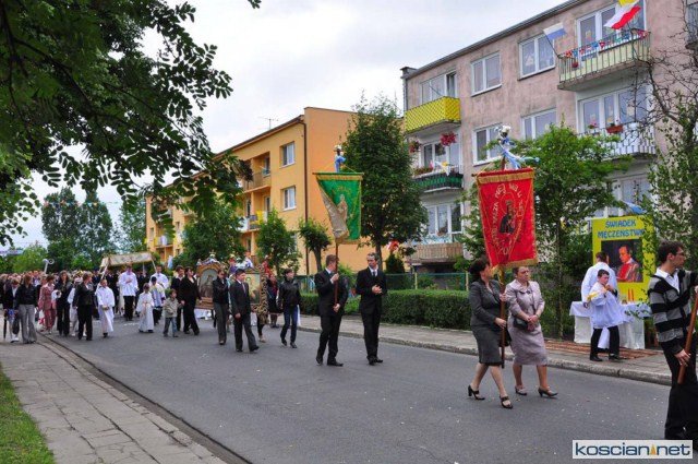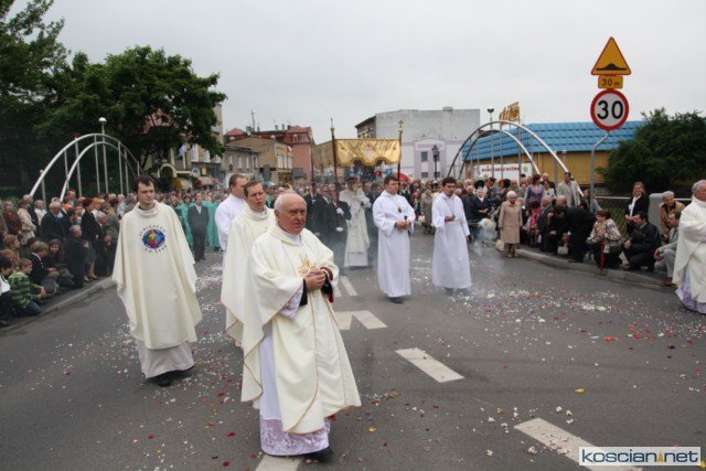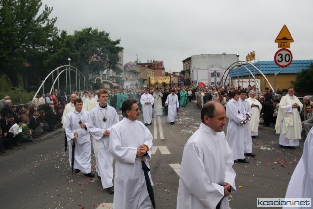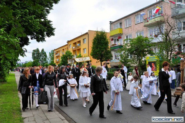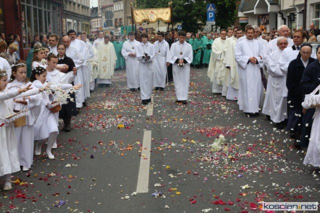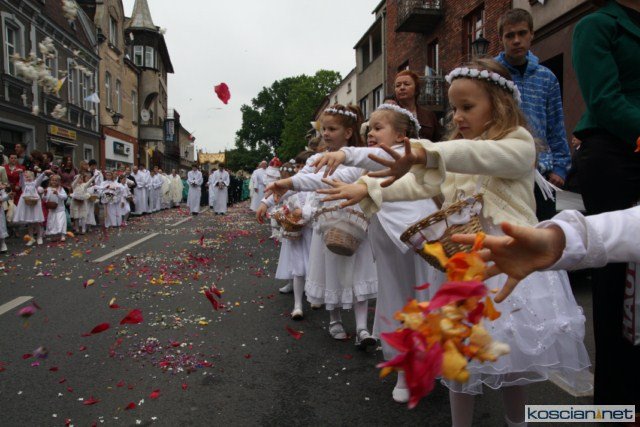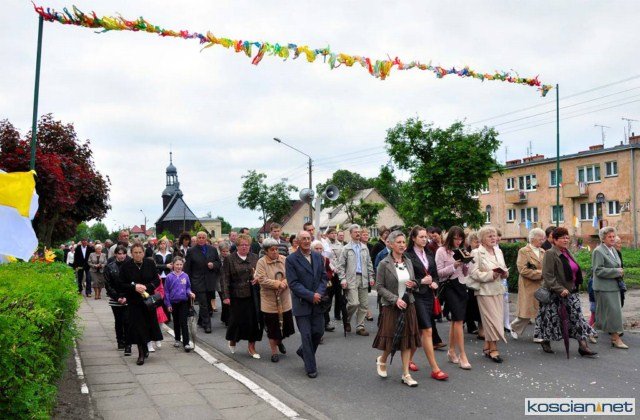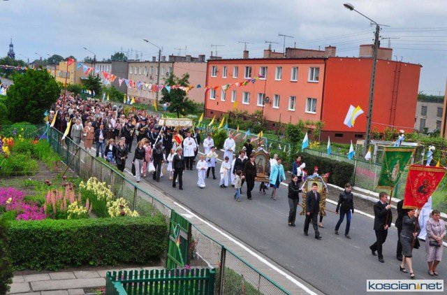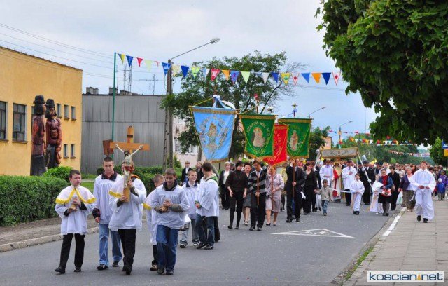 KOŚCIAN : wspólna procesja czterech kościańskich parafii wyruszyła z kościoła Ducha Świętego, ulicą Piłsudkiego przeszła na Rynek, gdzie przy trzecim ołtarzu odprawiono mszę świętą. Następnie ulicami Wrocławską i Kościelną przeszła do kościoła farnego.