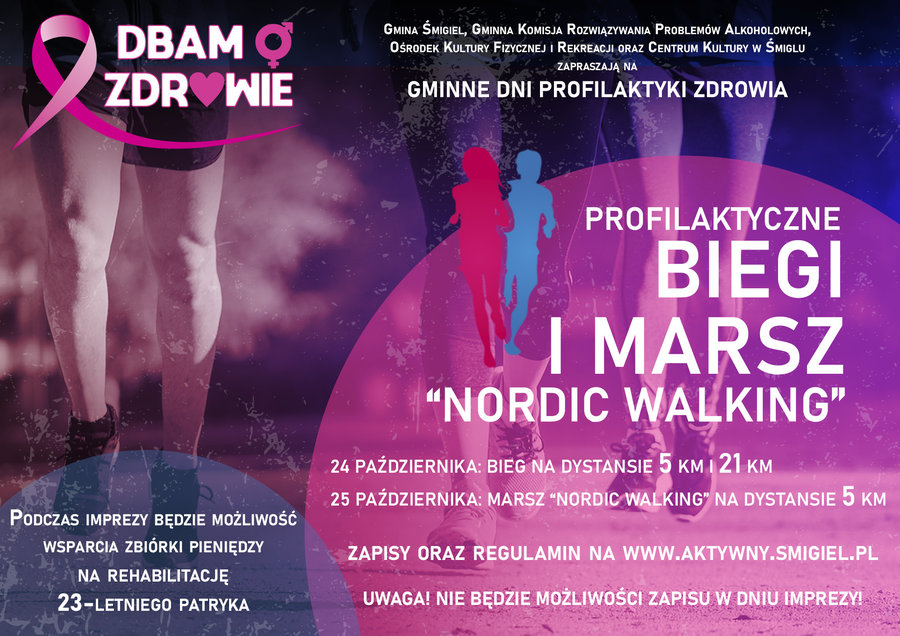 Październik jest miesiącem świadomości raka piersi. Z tej okazji burmistrz Śmigla zachęca do udziału imprezie sportowej i badaniach mammograficznych. Szczegóły dotyczące badań opublikowane będą na początku października. Natomiast na biegi i marsz nordic walking przyjmowane są już zapisy.
