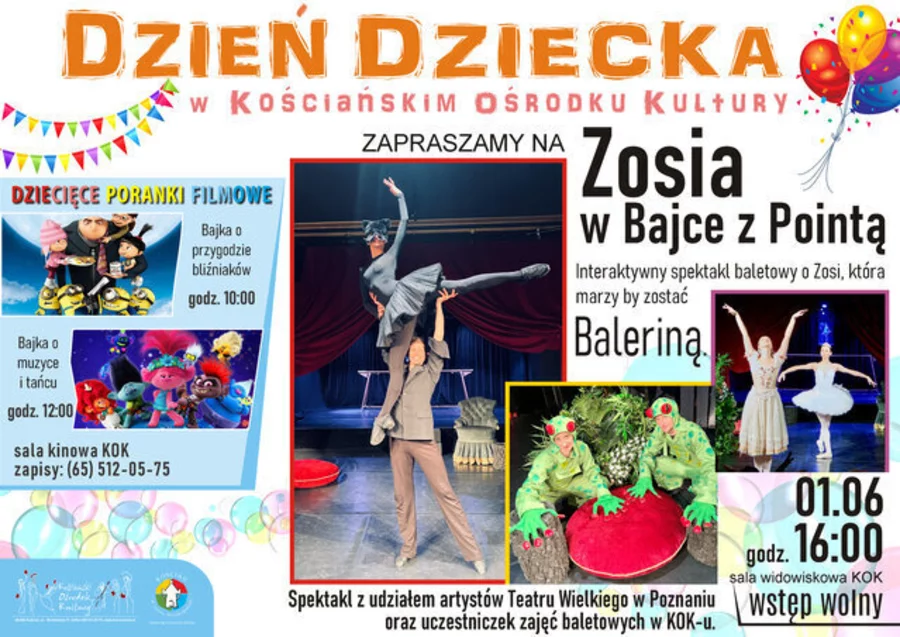 O godzinie 16., w sali widowiskowej rozpocznie się interaktywny spektakl baletowy "Zosia w Bajce z Pointą" z udziałem artystów Teatru Wielkiego w Poznaniu oraz uczestniczek zajęć baletowych w KOK-u.