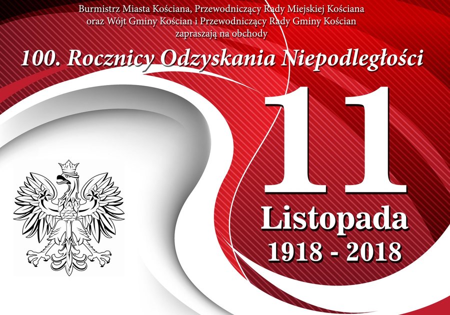 Burmistrz Miasta Kościana, Przewodniczący Rady Miejskiej Kościana oraz Wójt Gminy Kościan i Przewodniczący Rady Gminy Kościan zapraszają na obchody 100. Rocznicy Odzyskania Niepodległości.