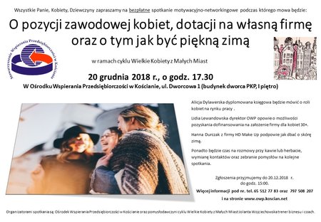 Spotkanie wpisuje cię w cykl „Wielkie Kobiety z Małych Miast”, którego pomysłodawczynią jest trenerka biznesu i coach Jolanta Wojciechowska. Zaproszenie skierowana jest do przedstawicielek płci pięknej. Wiek nie ma znaczenia. Tym razem będzie mowa o pozycji kobiet na rynku pracy, dotacjach na otwarcie działalności gospodarczej dla kobiet w wieku 30+ oraz o dbaniu o skórę zimą.