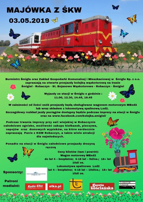 Na 3 maja zaplanowano także otwarte przejazdy Śmigielską Kolejką Wąskotorową. Zabytkowa ciuchcia ze stacji w Śmiglu ruszy o godz. 11, 12.30, 14.45 i 16.45. Szczegółowy rozkład jazdy dostępny będzie w dniu imprezy. Kolejka kursować będzie na trasie Śmigiel – Robaczyn – Stare Bojanowo. W Robaczynie na pasażerów czekać będzie ognisko. Miejscowe Koło Gospodyń Wiejskich przygotuje coś na ząb. Będzie można kupić: kiełbaski, pieczywo, napoje i domowe wypieki. Zaplanowano także atrakcje dla najmłodszych. Na stacji w Śmiglu będzie można spróbować swoich sił na drezynie ręcznej. Bilety na przejazd dla i z powrotem będzie można nabyć w kolejce.