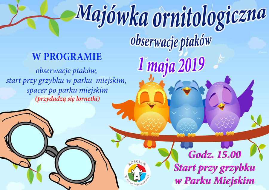 O godz. 15 rozpocznie się majówka ornitologiczna. Miłośnicy ptaków spotkają się przy grzybku w Parku Miejskim. Ruszą na spacer. Przydadzą się lornetki. Na zakończenie zaplanowano ognisko.